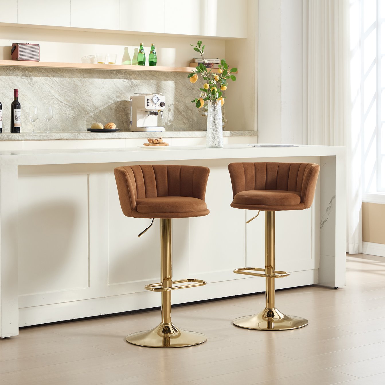 Bring contemporary flair and everyday comfort to your kitchen, home bar, or dining nook with this stylish set of two swivel bar stools. Upholstered in soft orange velvet with elegant golden legs and a chrome footrest and base, these stools combine a modern aesthetic with practical features—ideal for busy homes, cafes, or entertainment spaces.