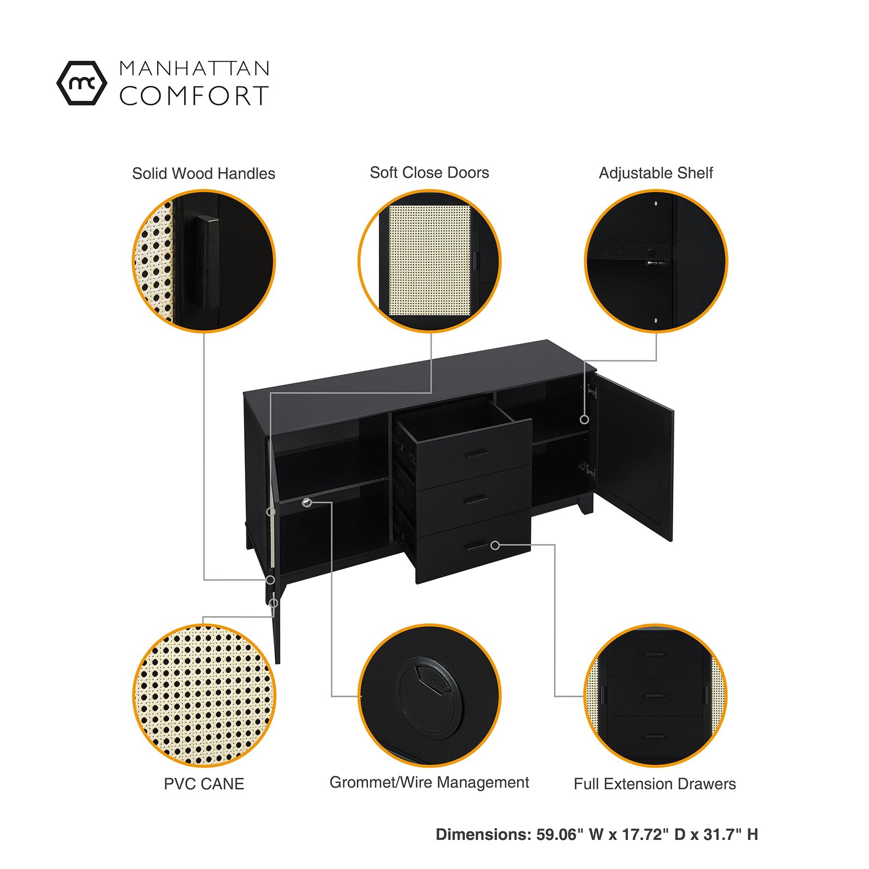 Elevate your living room with the Sheridan 59" Sideboard — a stylish, functional media console that blends modern design with practical storage. Finished in sleek black with a durable melamine-coated MDF frame and PVC cane accents, this sideboard is crafted to organize media components, conceal clutter, and support a television while adding a refined, lifted silhouette to your space.