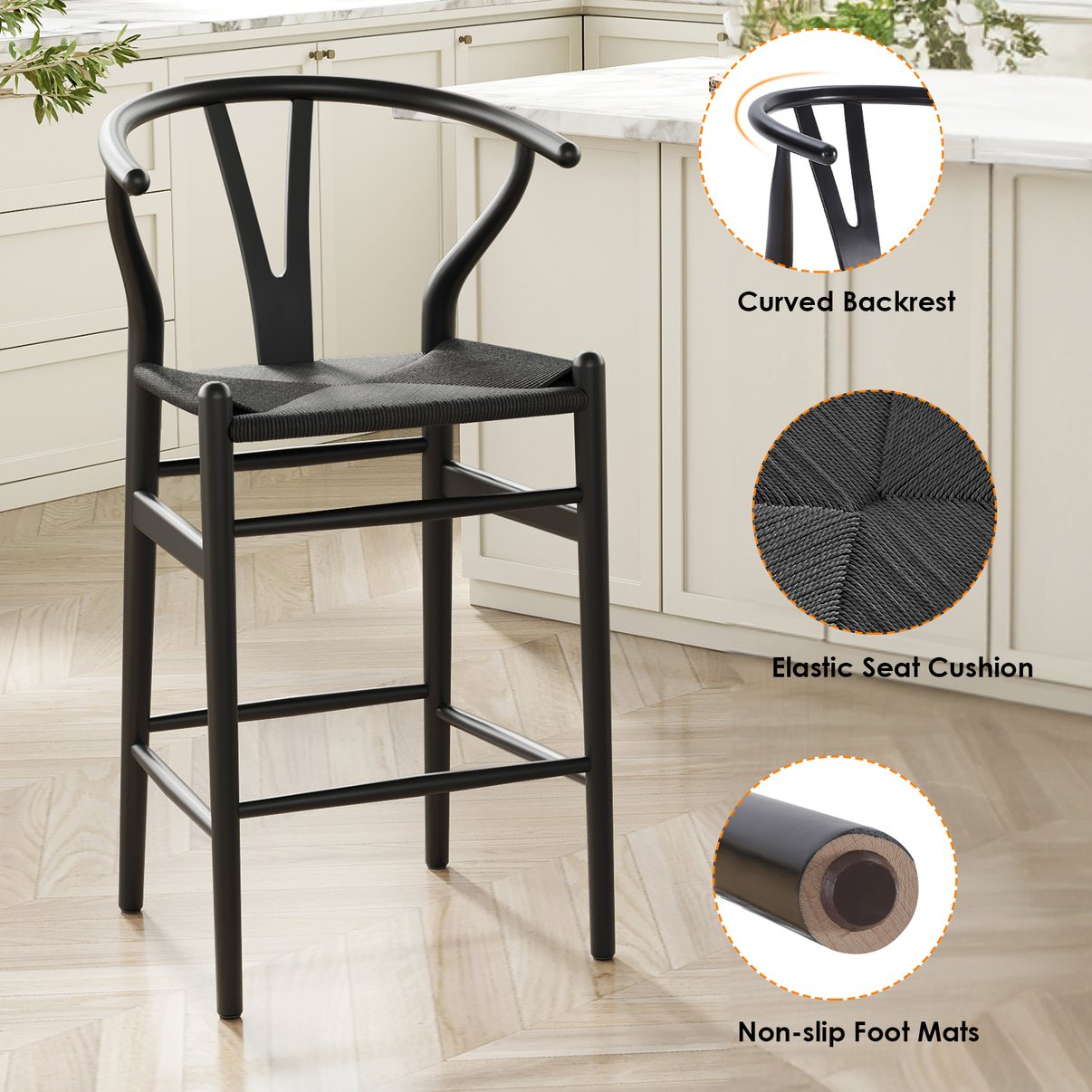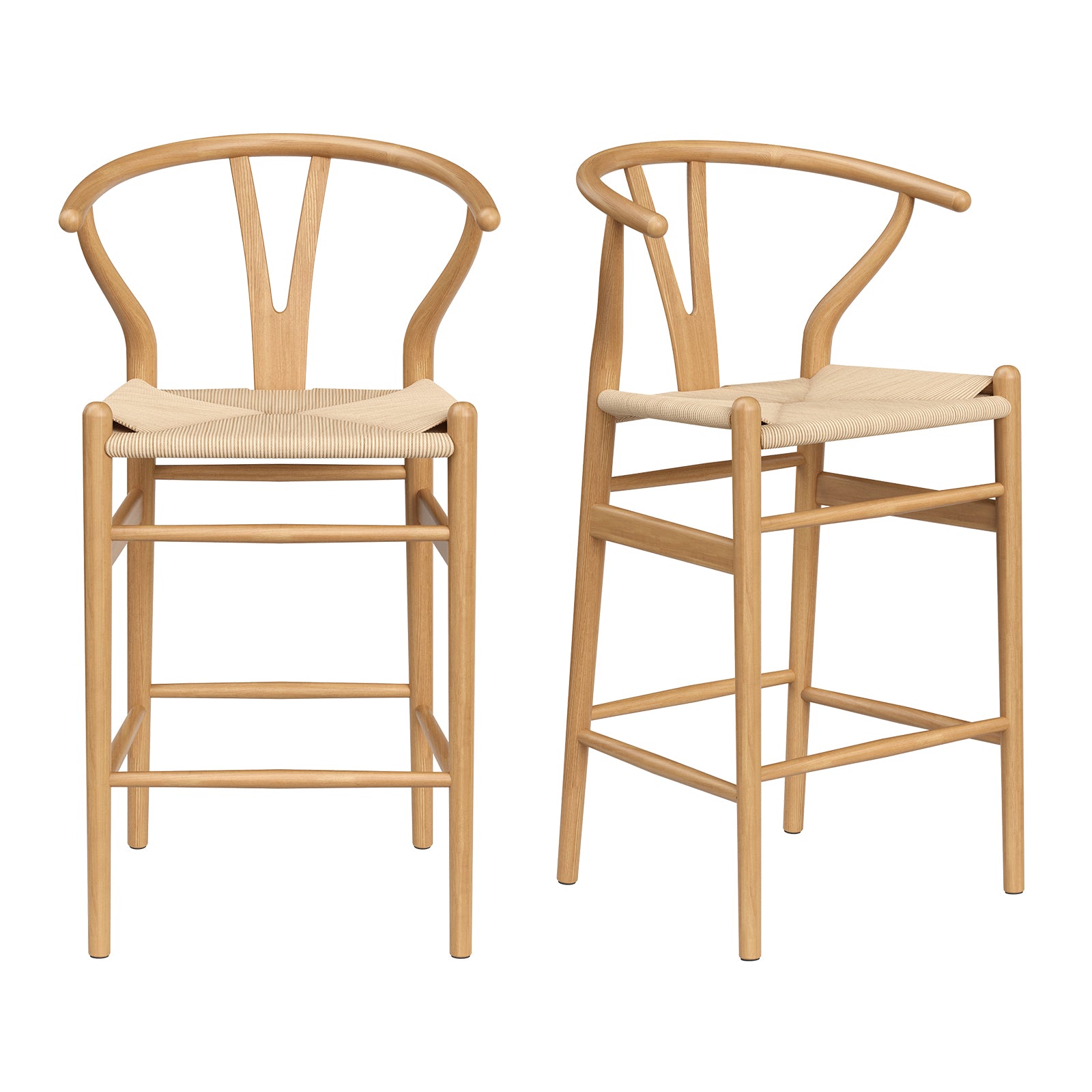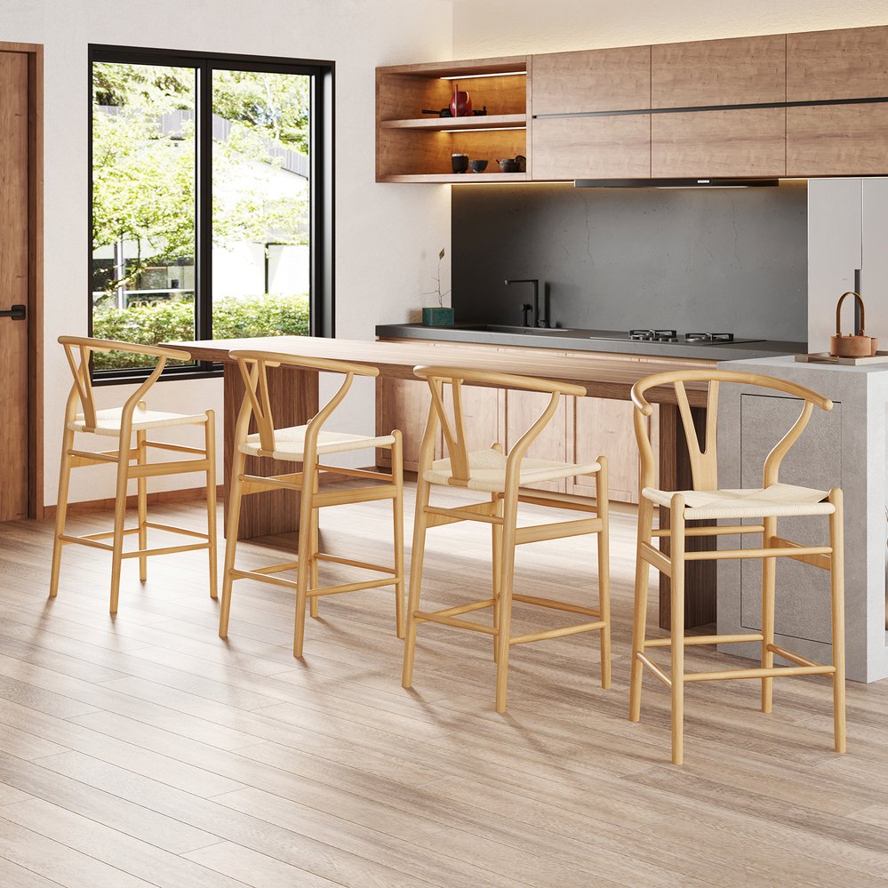 Bring natural warmth and timeless craftsmanship to your kitchen island or dining area with this fully assembled Wishbone-style barstool. Handcrafted from solid ash wood and topped with a woven papercord seat, this counter-height stool combines classic Scandinavian-inspired design with durable construction and eco-friendly finishes — perfect for restaurants, home bars, or casual seating around the house.