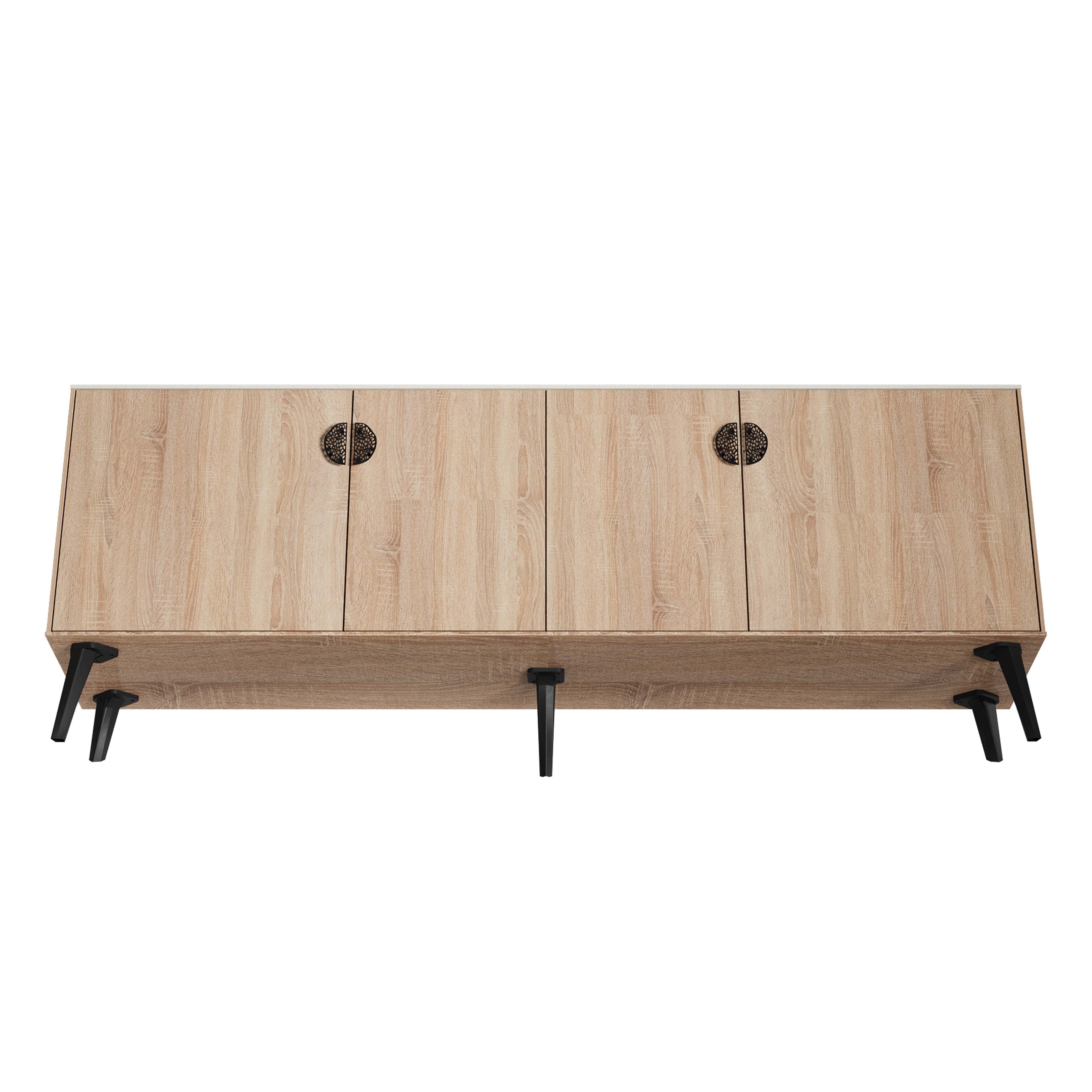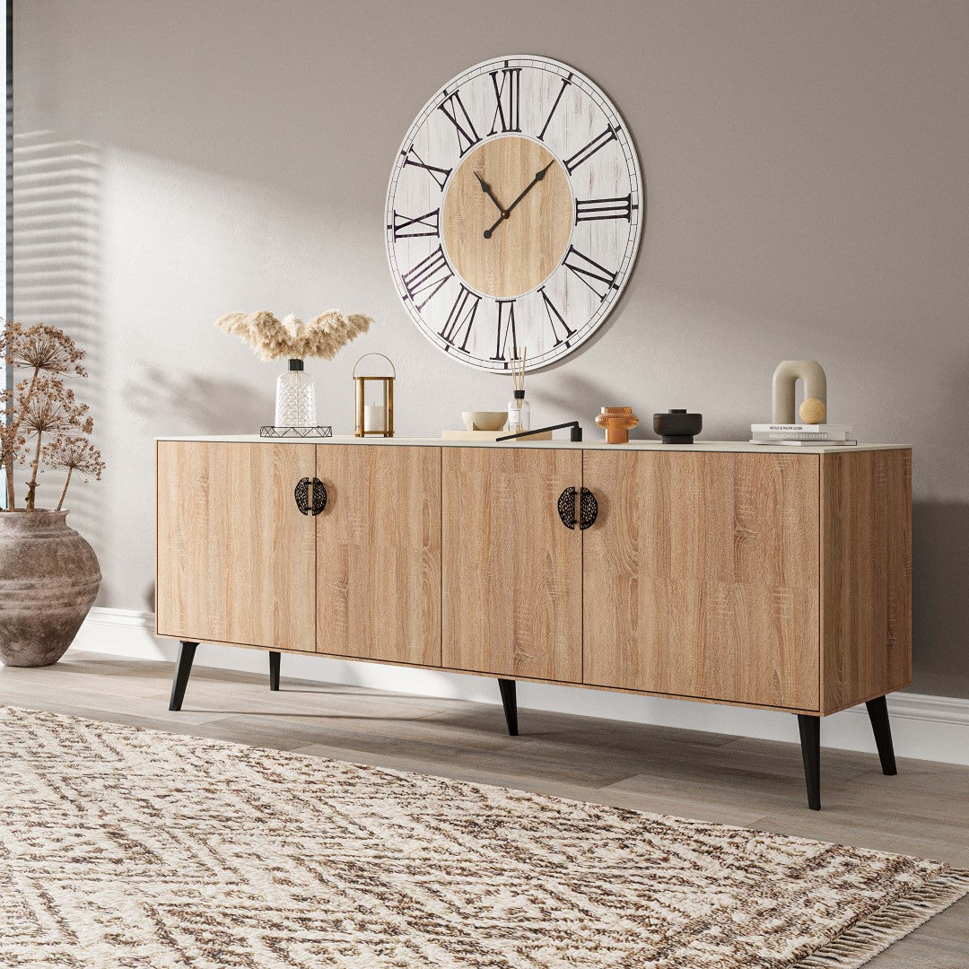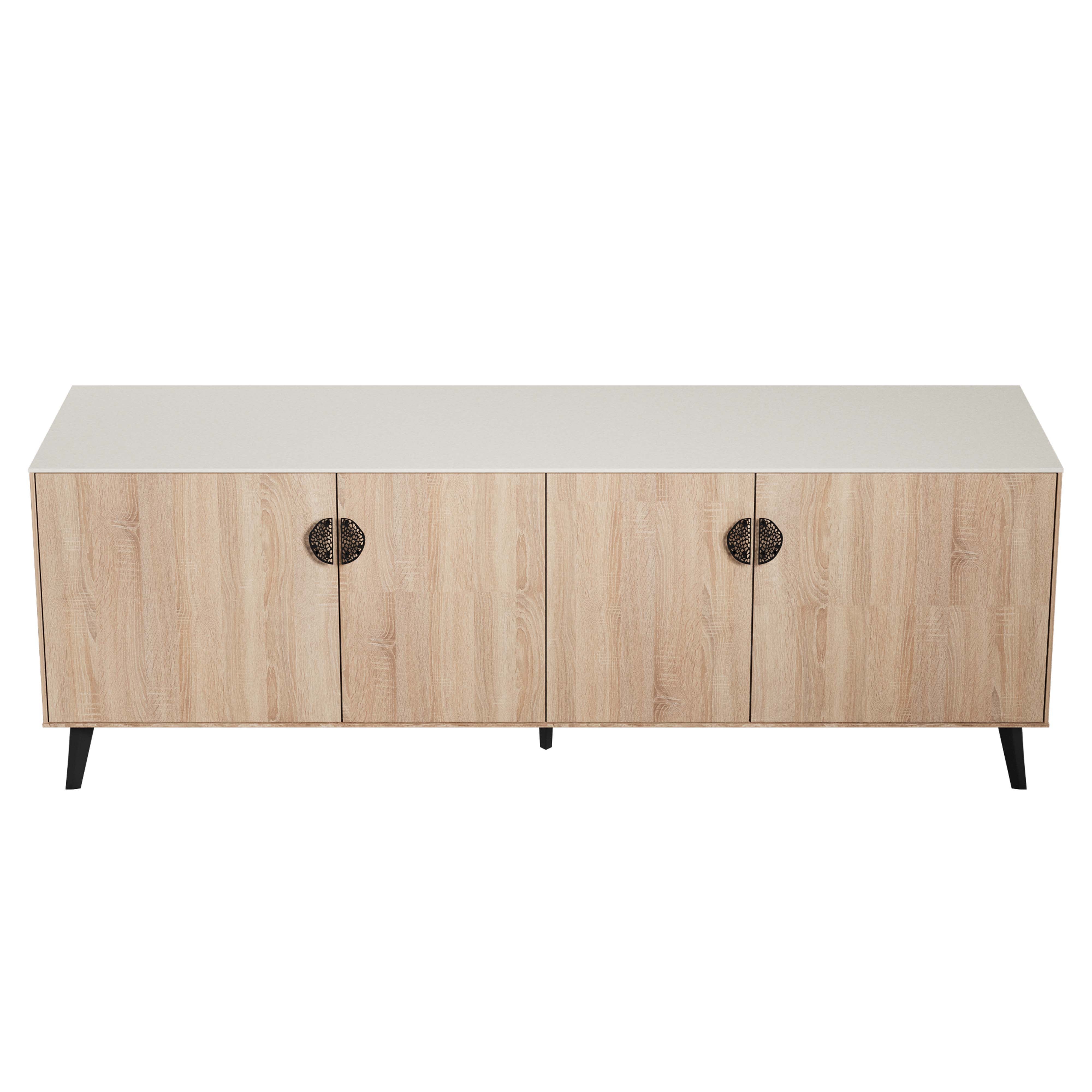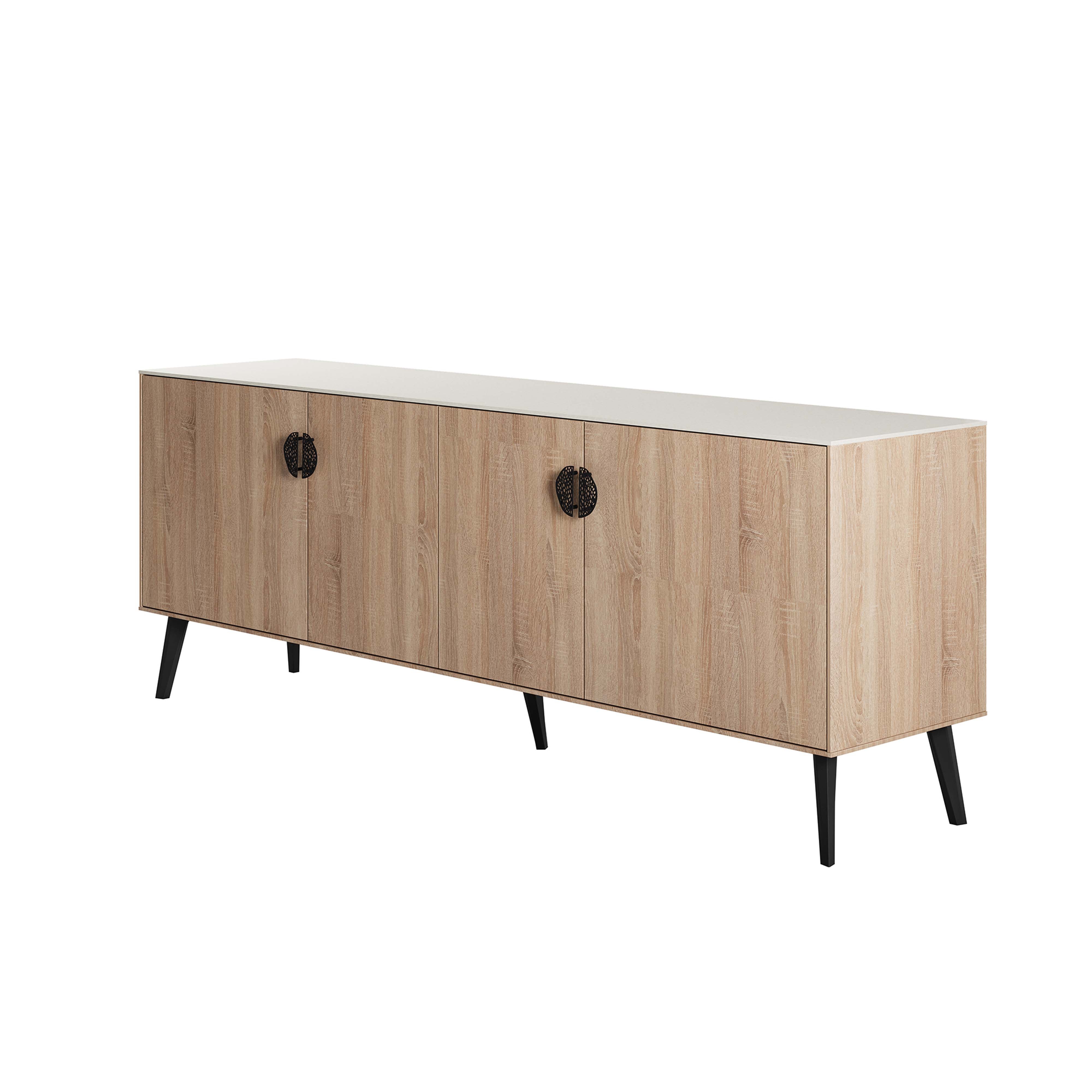 Immerse yourself in the captivating allure of the Haley Collection, a symphony of Mid-Century Modern elegance and functionality. Light neutral tones and the gentle embrace of wood grain elevate each piece, inviting you to indulge in its timeless beauty. Picture yourself surrounded by the seamless integration of style and space-saving design, as every detail whispers tales of enduring sophistication. Transform your living space into a haven of unparalleled elegance with the Haley Collection, where every element harmonizes to create a sanctuary of beauty and grace.- Mid-Century Modern Buffet Stand and Sideboard for Dining and Living Room Use.
