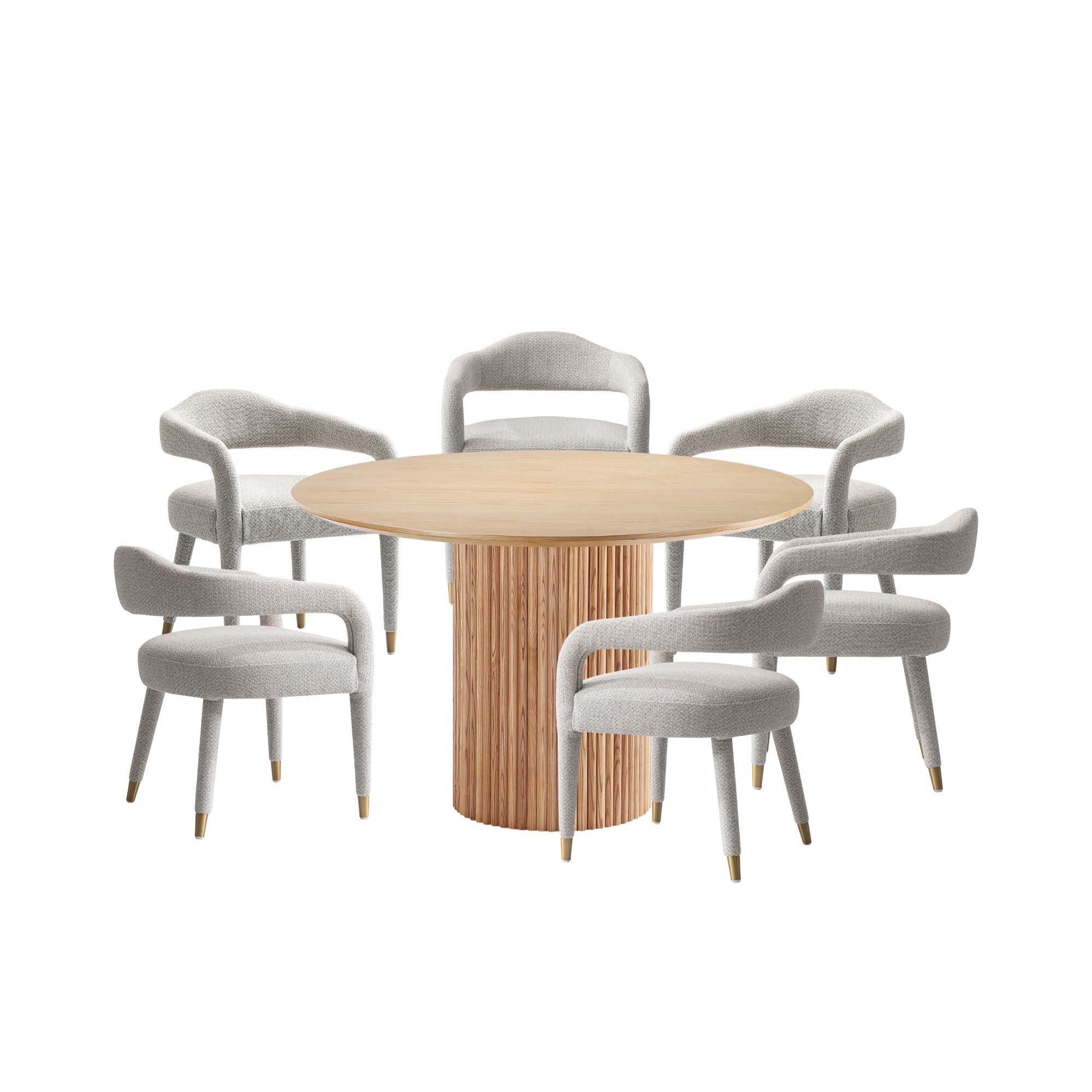 Description for 6-DT05DC093AR-NASL Manhattan Comfort 7-Piece Hathaway Modern 59.05 Solid Wood Round Dining Set in Natural with 6 Aspen Tweed Upholstered Dining Chairs in Silver Lining