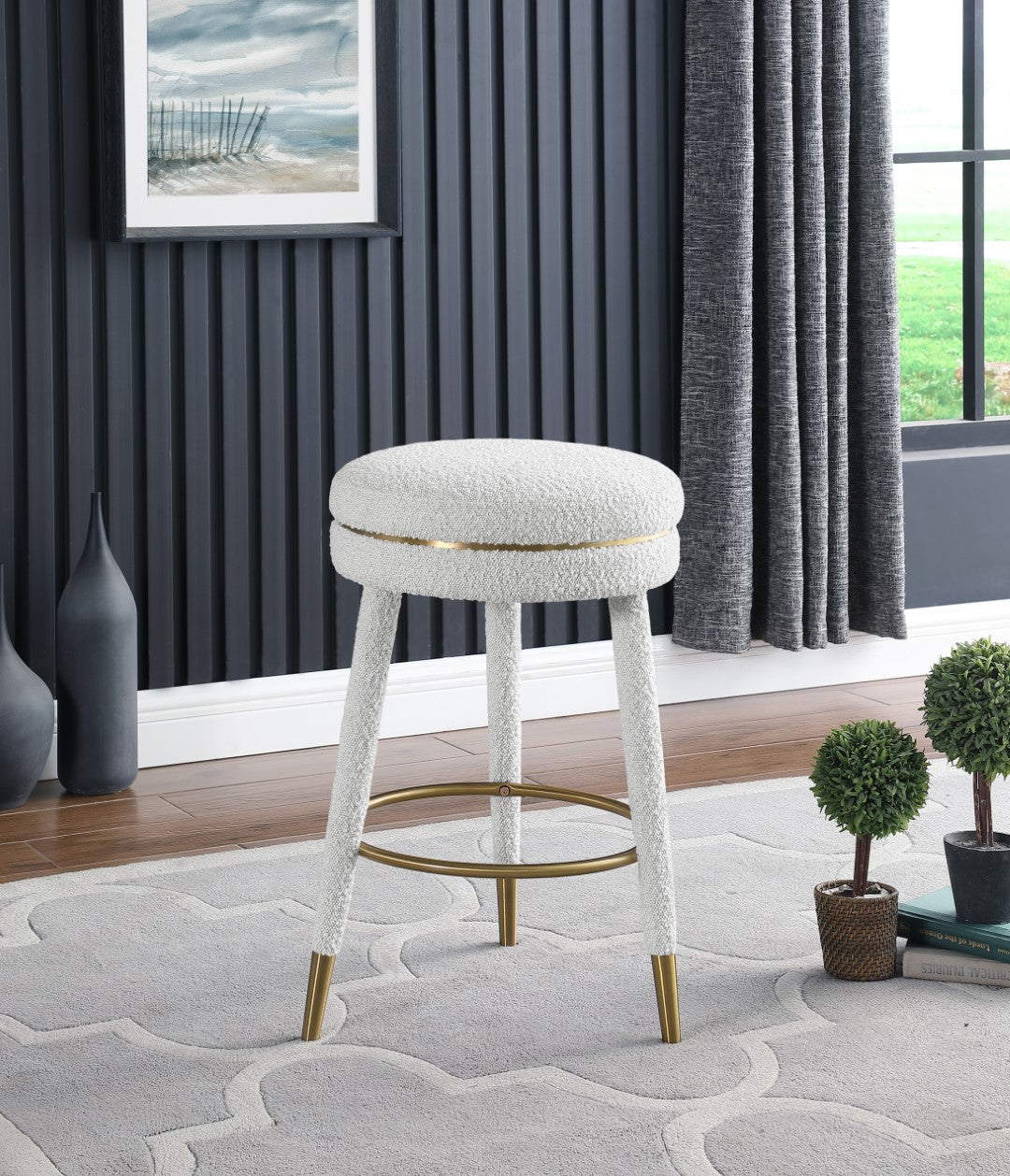 - Material: Boucle Fabric / Stainless Steel / Plywood / Foam