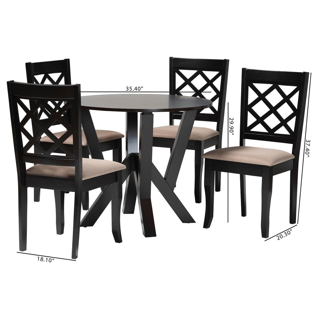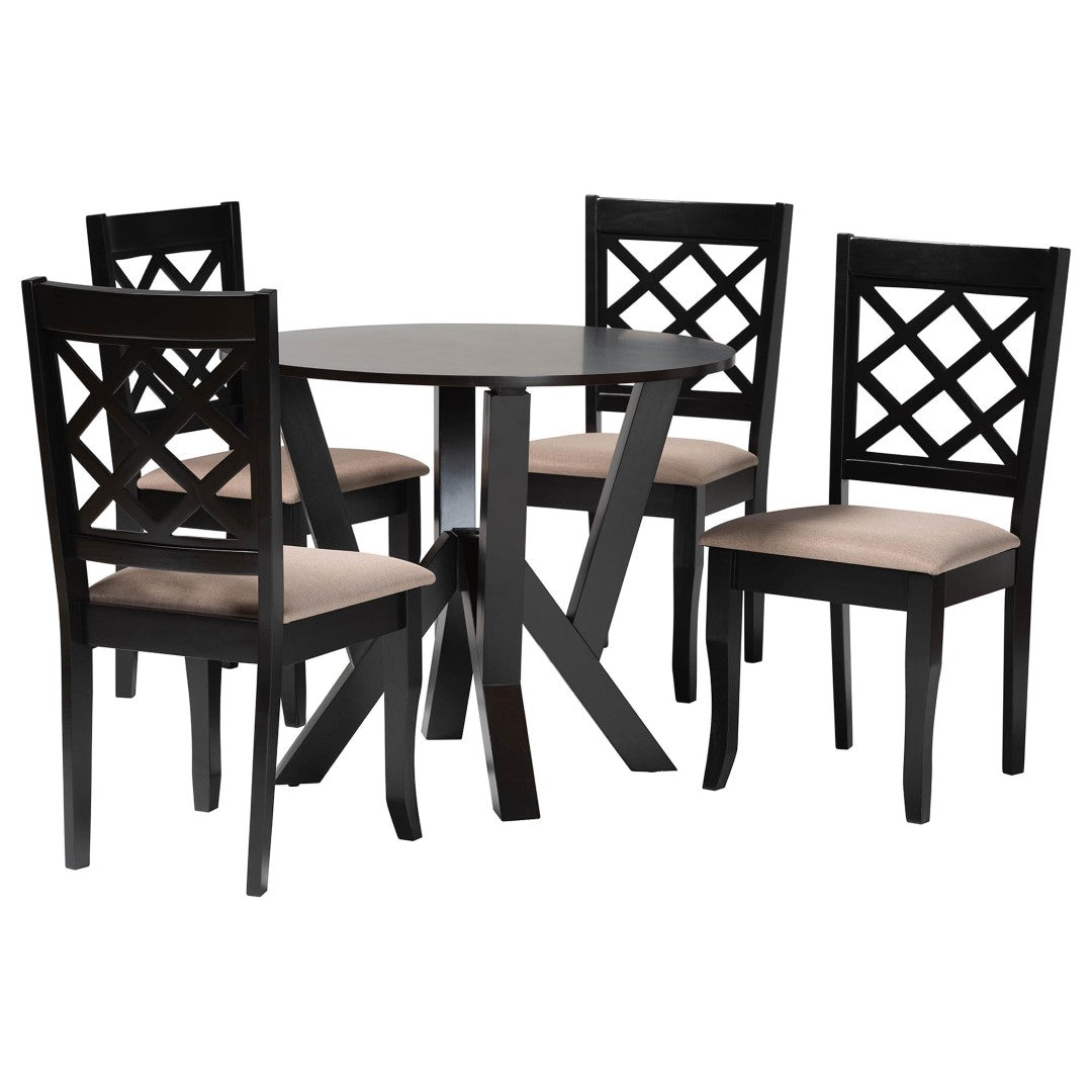 Refresh your dining space with the Adina 5-piece dining set — a sleek, modern ensemble that combines warm sand fabric upholstery with rich dark brown wood for an inviting yet contemporary look. Designed for everyday comfort and visual appeal, this set brings sculptural design details like saber legs and a geometric table base, while offering practical seating for up to four.
