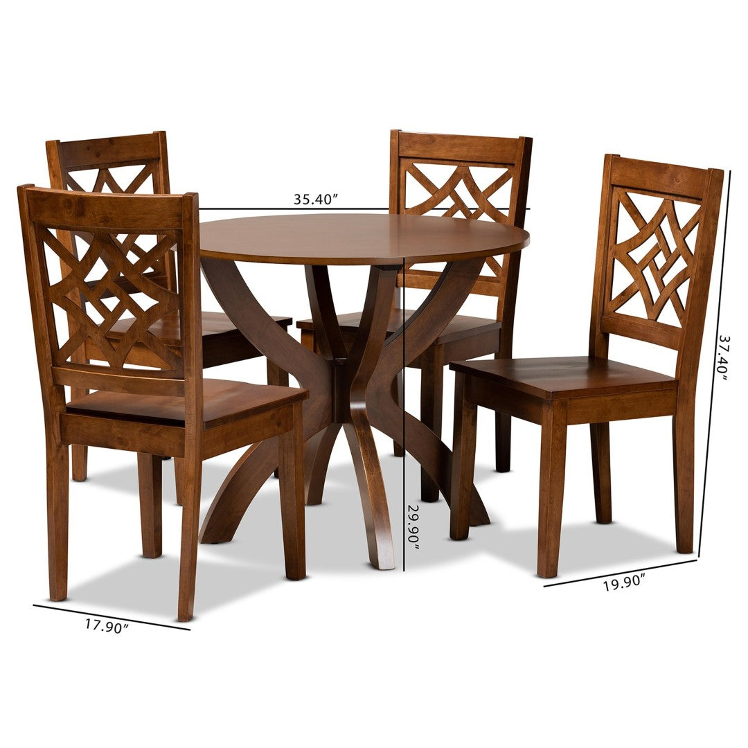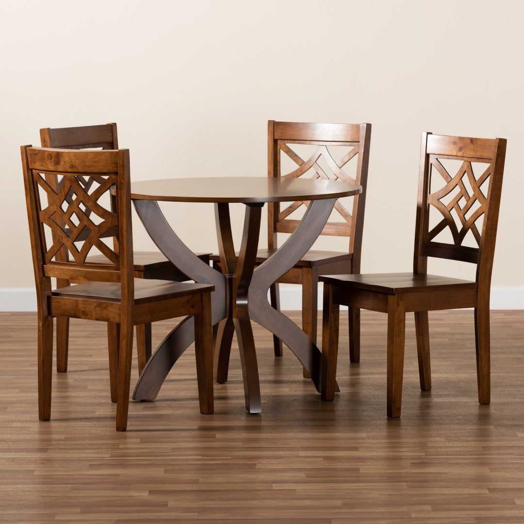 Introduce a touch of modern warmth to your dining area with this stylish 5-piece walnut brown wood dining set. Thoughtfully designed for both everyday meals and special gatherings, the set pairs a spacious circular table with four ergonomically shaped chairs that feature a sculpted scoop seat and geometric cut-out backs for an eye-catching, contemporary silhouette.