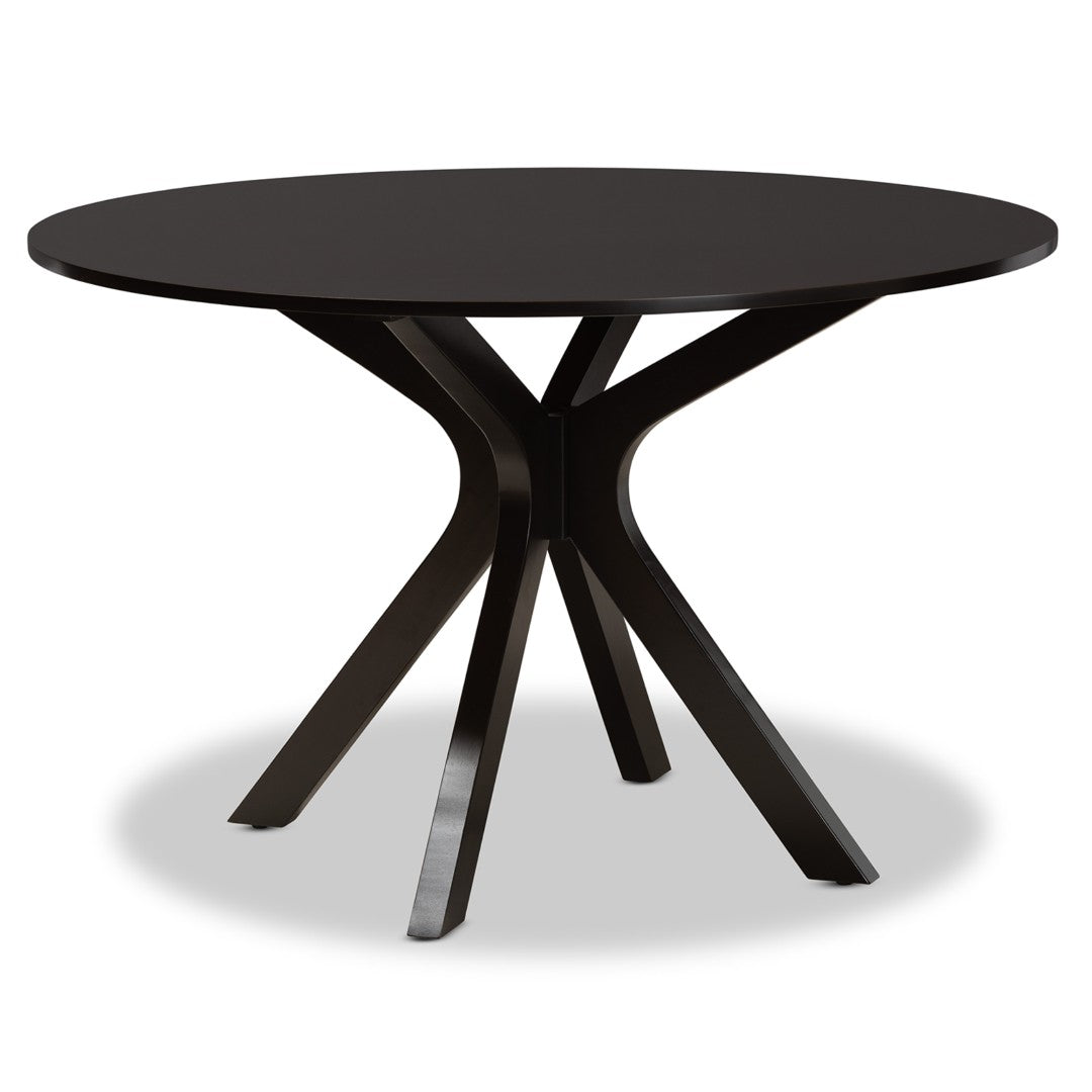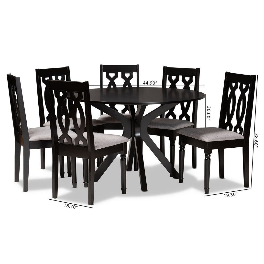 Bring modern warmth and everyday comfort to your dining area with the Callie 7-piece set. Combining a rich dark-brown wood finish with smooth grey fabric upholstery and thoughtful details like a cut-out chair back and a circular tabletop, this set balances contemporary style with functional comfort for casual meals or formal gatherings. Built from durable mixed woods and padded for seating comfort, Callie makes an elegant yet practical focal point for homes that value clean lines and inviting texture.