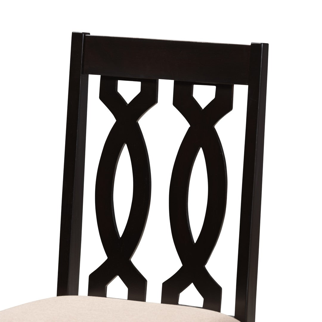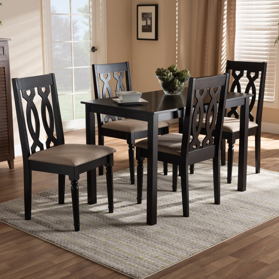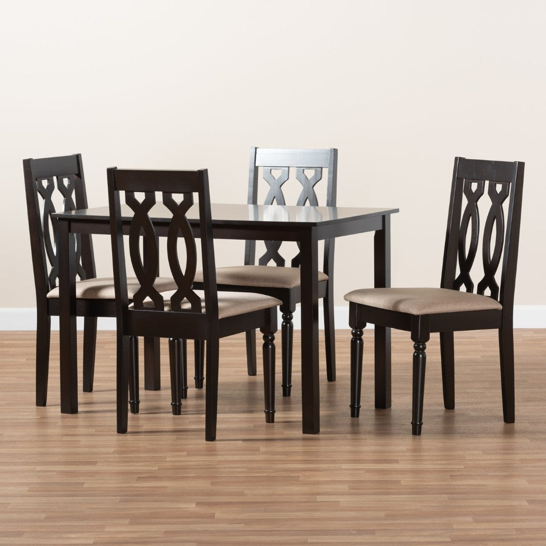 Elevate your dining room with the Cherese 5-piece set, a balanced blend of modern lines and classic details. Crafted from solid oak with a rich espresso brown finish and light polyester upholstery, this set offers comfortable seating and refined styling—plush foam-padded chairs with elegant cut-out backs and turned legs bring both visual interest and everyday usability. Designed for family meals and intimate gatherings, the Cherese set combines durable construction with a warm, contemporary aesthetic.