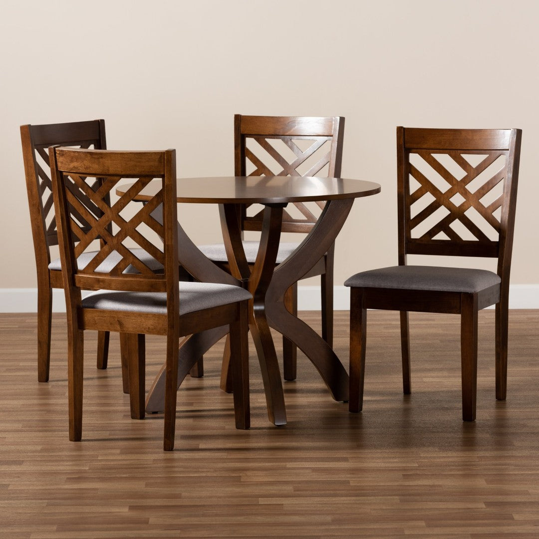 Elevate your dining area with the Edona 5-piece set — a tasteful blend of modern and contemporary design, warm walnut tones, and soft grey upholstery. Thoughtfully crafted in Malaysia, this set combines durable wood construction with comfortable, foam-padded seating and a distinctive cut-out chair back for a refined yet inviting meal-time experience. Perfect for everyday family meals or intimate dinner gatherings, the Edona set balances style, comfort, and functionality.