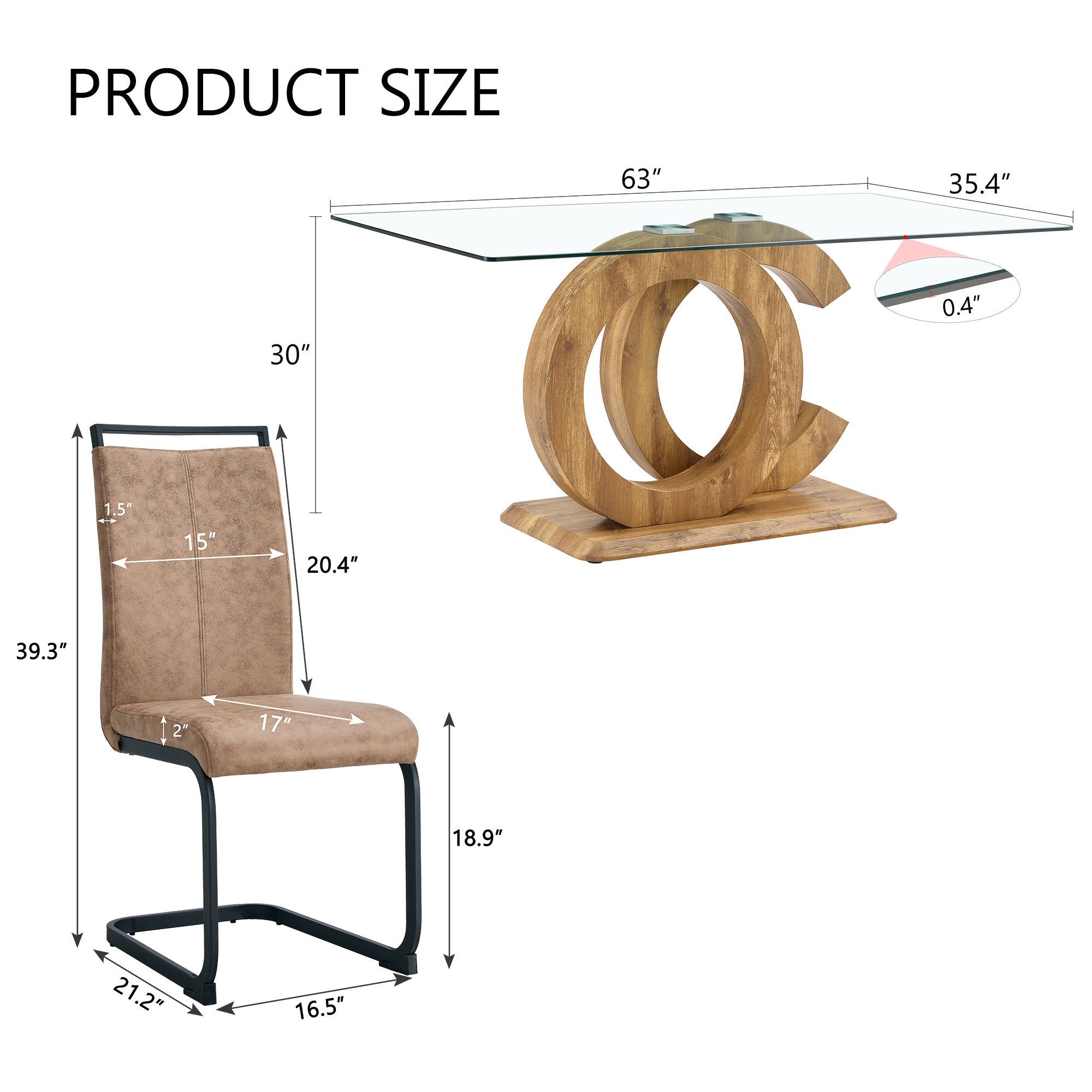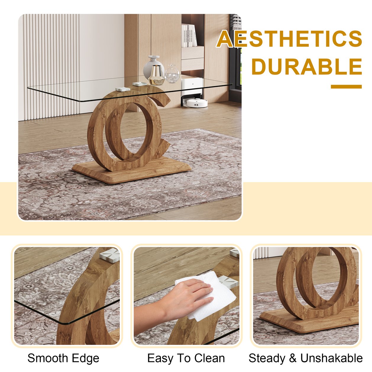 - Clear Tempered Glass Top: Offers a transparent visual effect, enhancing the sense of space, while providing the safety and durability of tempered glass.Unique OC-Shaped Design: The legs are made of wood color MDF with an OC-shaped design that is not only stable but also features a distinctive modern aesthetic.The wooden MDF legs of the table add a touch of natural atmosphere to your home.