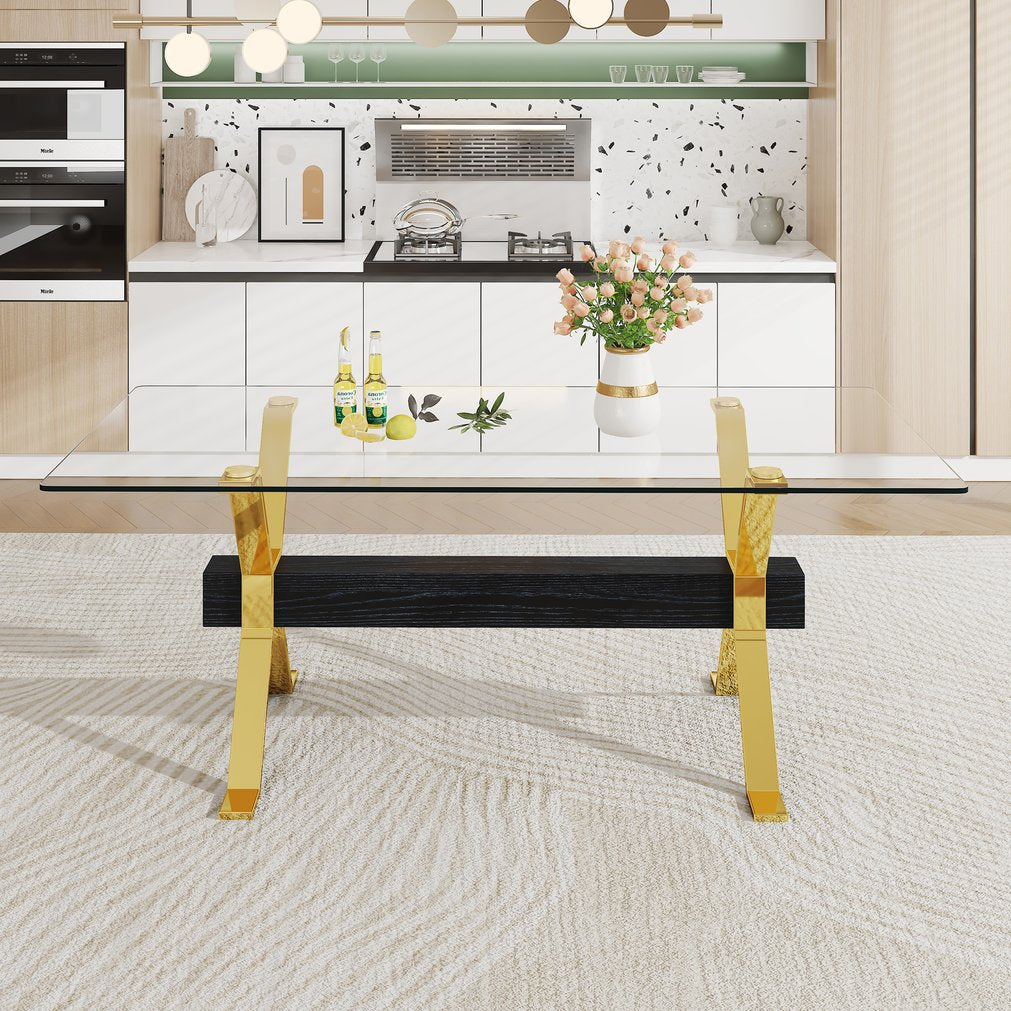 Elevate your dining or workspace with this modern, minimalist rectangular table set — a refined combination of tempered glass and gold-plated metal accents paired with eight comfortable black PU chairs. Designed for contemporary interiors, the set balances luxury and practicality: a clear tempered glass top for a light, open feel; sturdy plated metal and MDF legs for lasting stability; and easy assembly so you can enjoy the full look quickly.