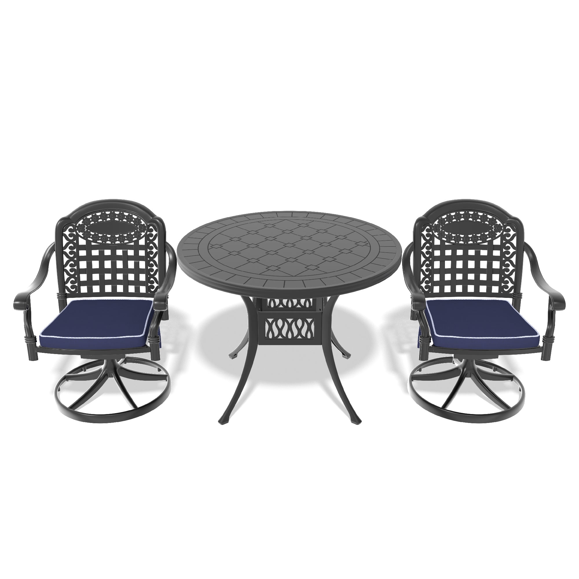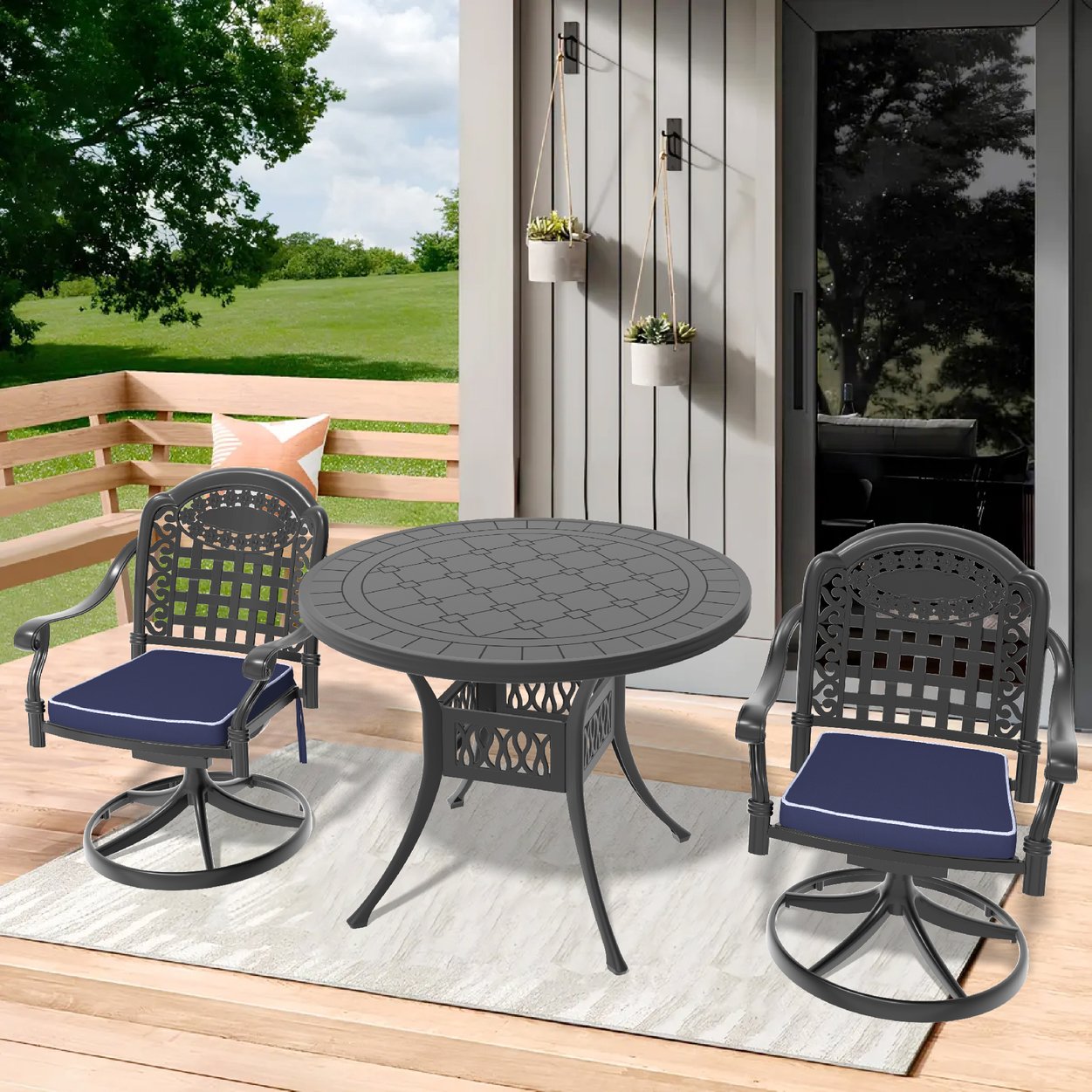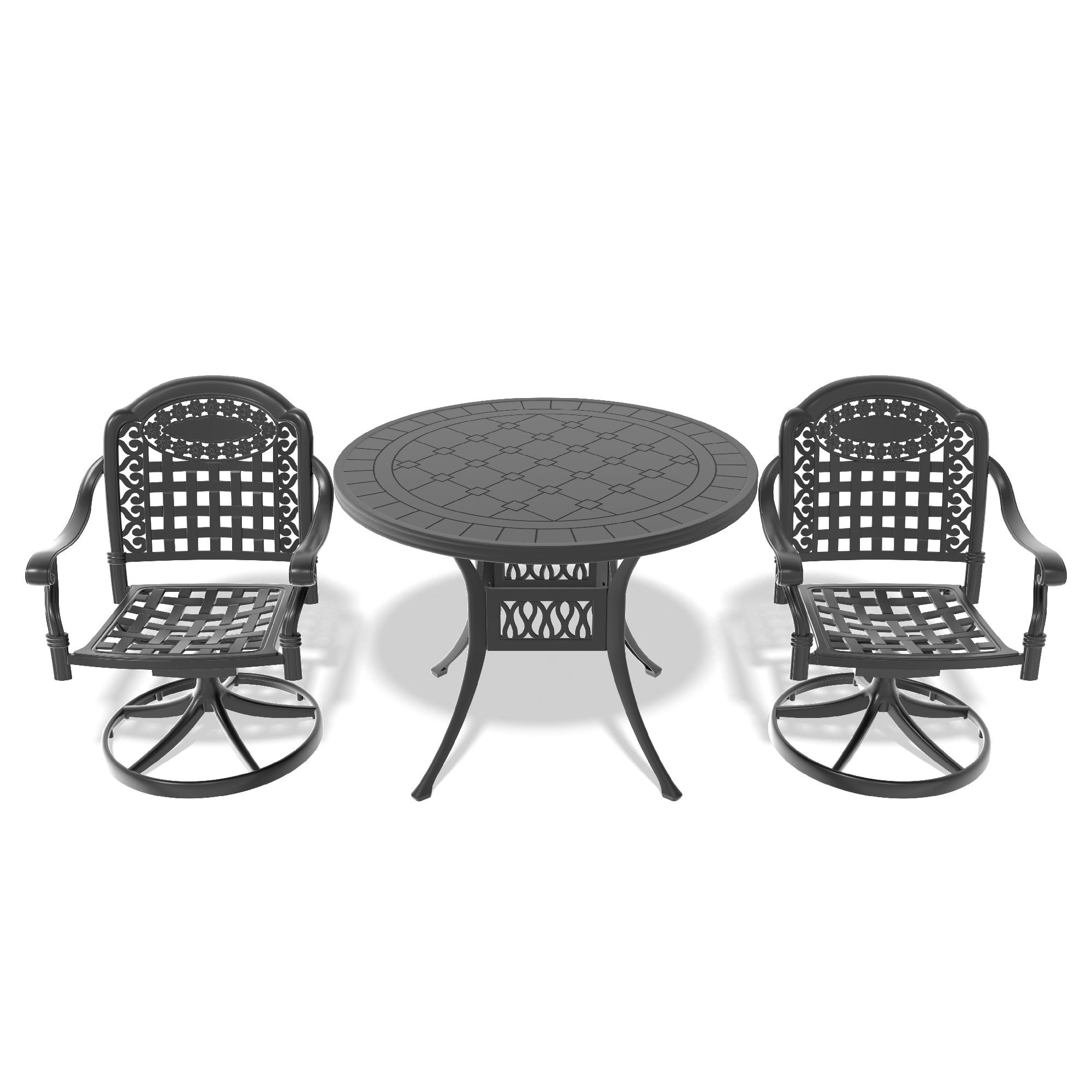 Enjoy intimate outdoor dining with this durable 3-piece all-weather cast aluminum set, designed for small patios, balconies, or cozy garden nooks. The set includes two swivel chairs with comfortable cushions and a 39.37" round table — all finished in a sleek black frame that resists rust and requires minimal maintenance. Crafted for both style and functionality, this compact dining set supports everyday use while providing swivel convenience and ample tabletop space.