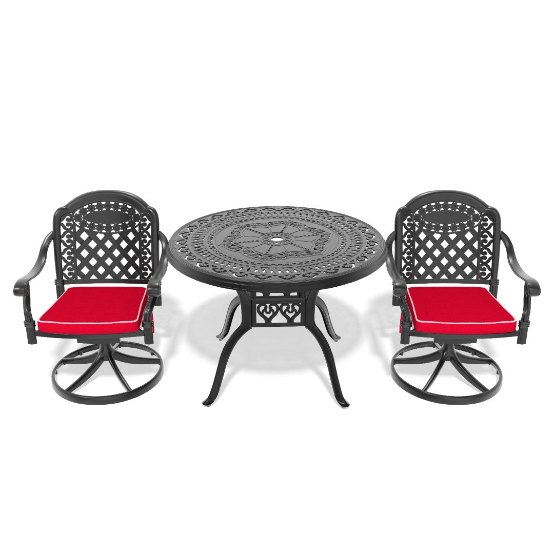 Bring durable, stylish comfort to your outdoor dining with this 3-piece all-weather cast aluminum set. Designed for small patios, balconies, or cozy garden corners, the set combines rust-resistant aluminum construction with swivel seating and plush cushions—delivering easy conversation, effortless access, and lasting performance through the seasons.