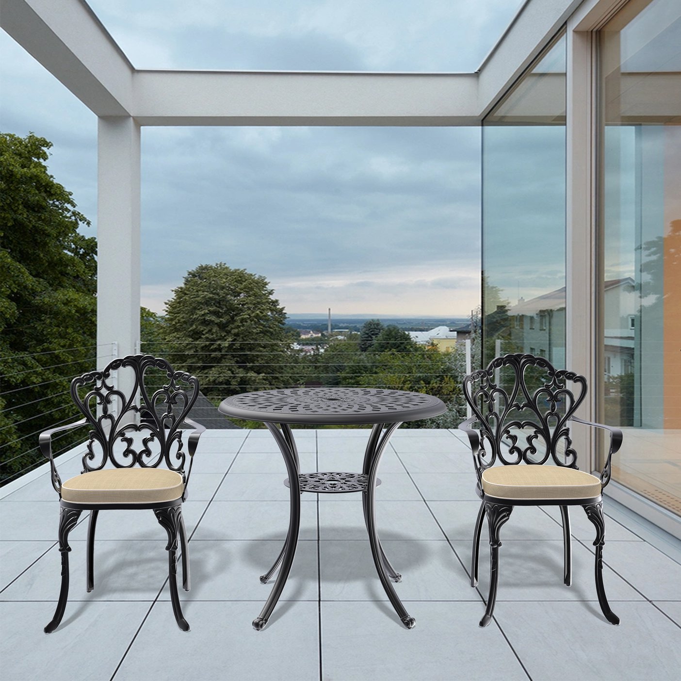 Enjoy cozy outdoor dining with this elegant 3-piece cast aluminum patio set, thoughtfully designed to combine classic styling with durable construction. The round table and two ergonomic chairs come with plush beige cushions for comfort, a built-in umbrella hole for shade, and a weather-resistant finish that keeps the set looking great season after season—perfect for compact patios, balconies, or garden nooks.