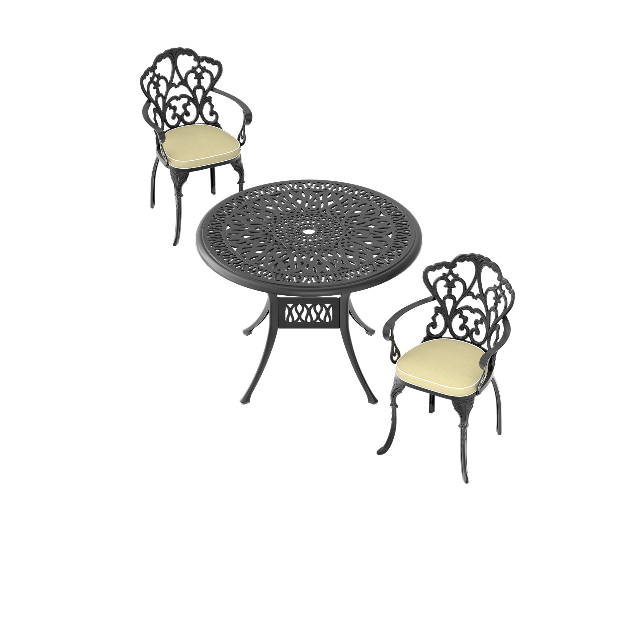 Enjoy relaxed alfresco dining with this elegant 3-piece cast aluminum patio set, designed for durability, comfort, and effortless maintenance. The set includes a round table and two ergonomic chairs with beige cushions, offering a compact footprint ideal for balconies, small patios, or cozy garden corners. Built from rust-resistant cast aluminum and engineered to support everyday use, it combines classic styling with practical features like an umbrella-ready table top and easy assembly.