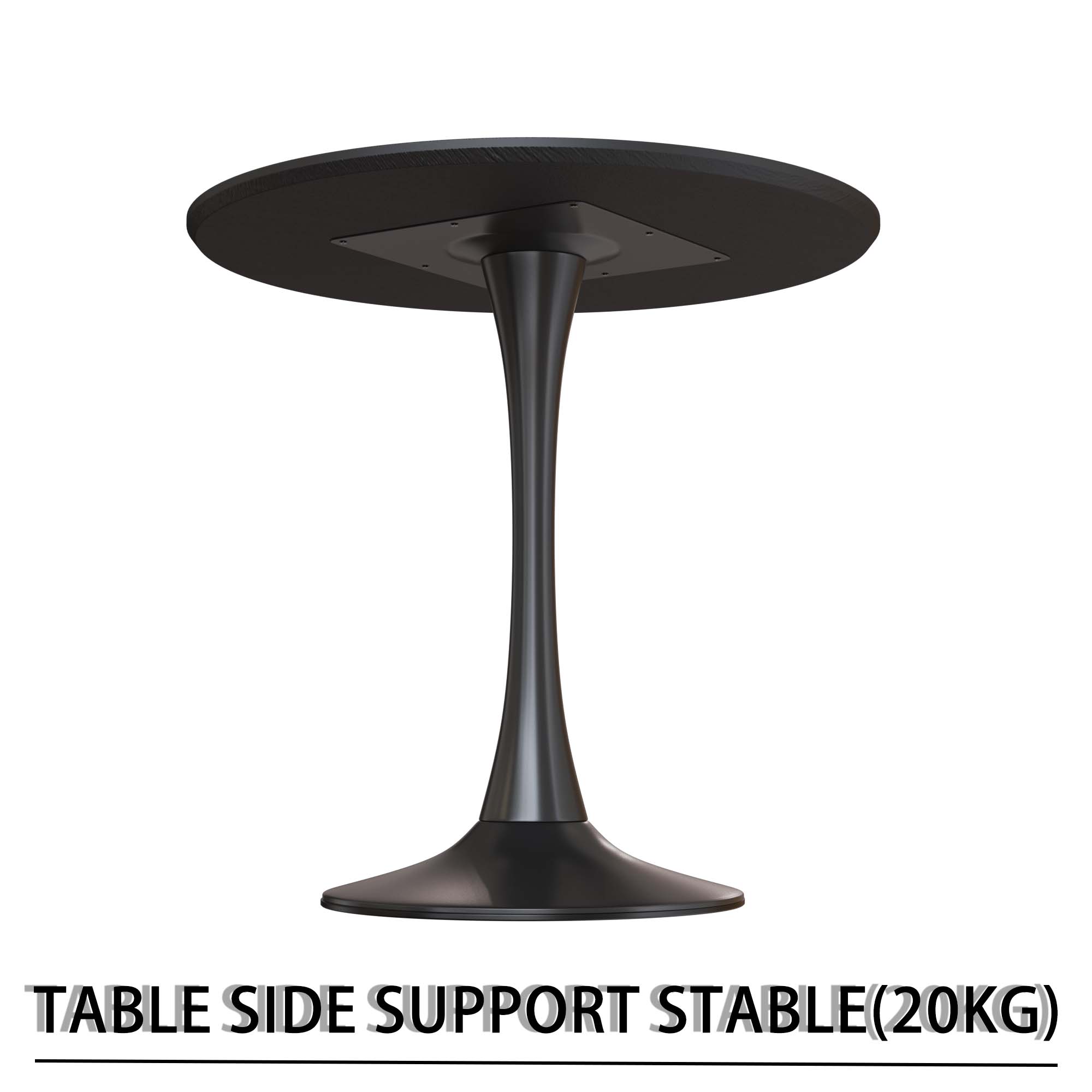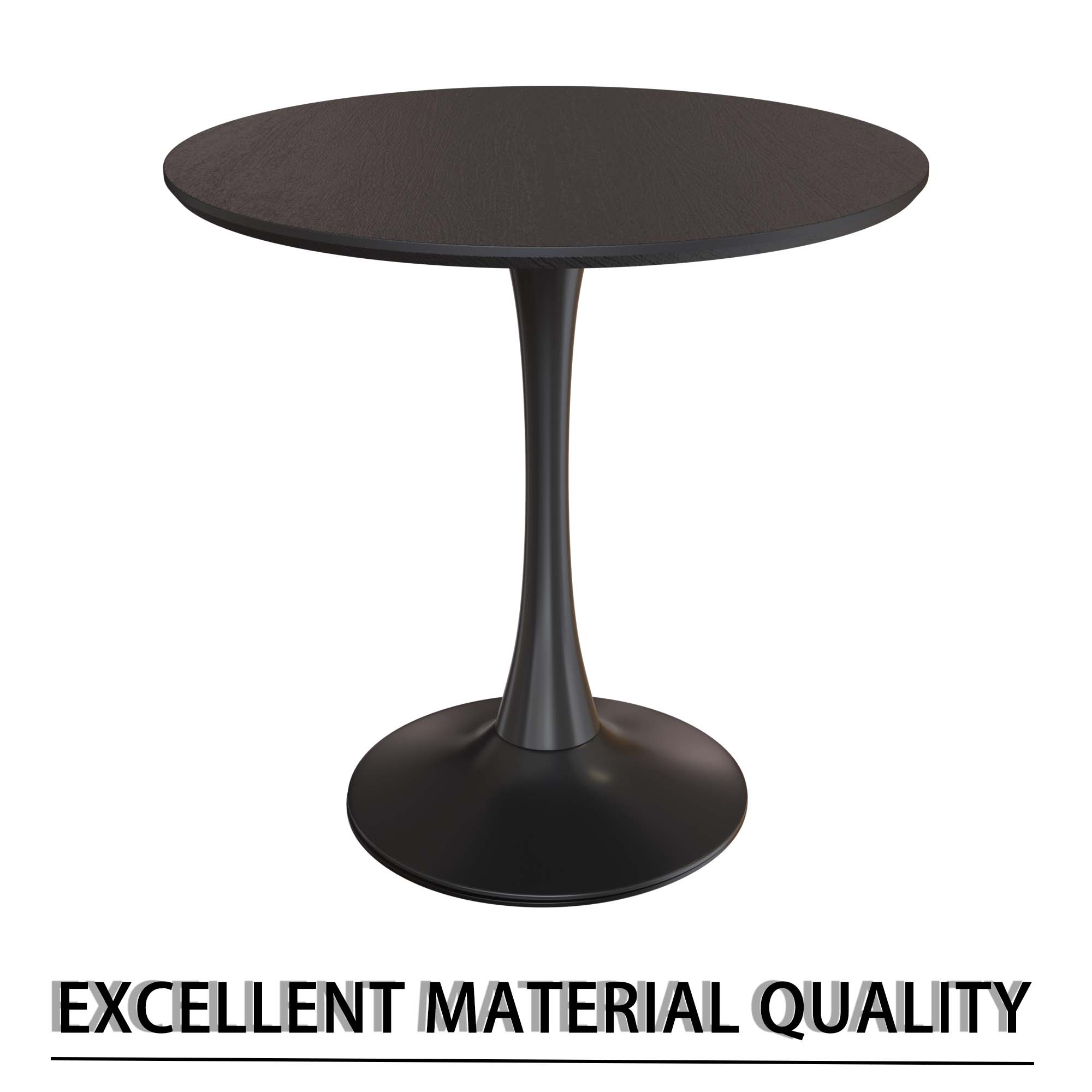 - Table design: Round tulip-style table with modern mid-century silhouette; MDF tabletop with a sleek black finish and a pedestal metal base that preserves legroom.