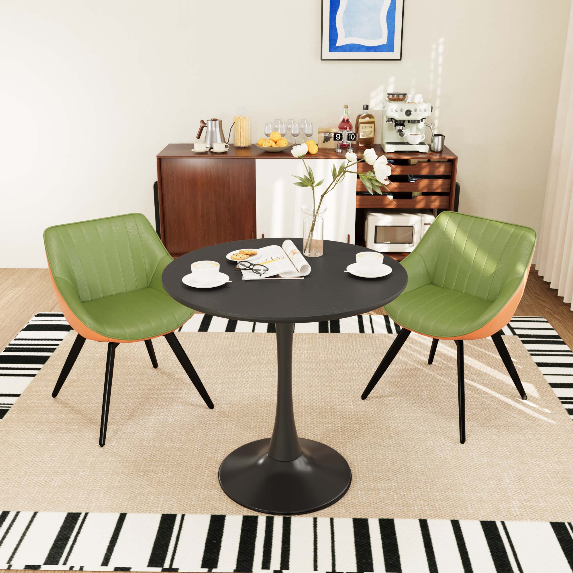 Bring modern mid-century style and everyday comfort to your kitchen or dining nook with this sleek 3-piece set: a black round tulip-style MDF table paired with two cushioned artificial-leather chairs on black metal legs. Thoughtfully designed for 2–4 people, the set combines a space-saving footprint, sturdy construction, and versatile styling that works as a dining set, breakfast table, or casual seating for office and living areas.