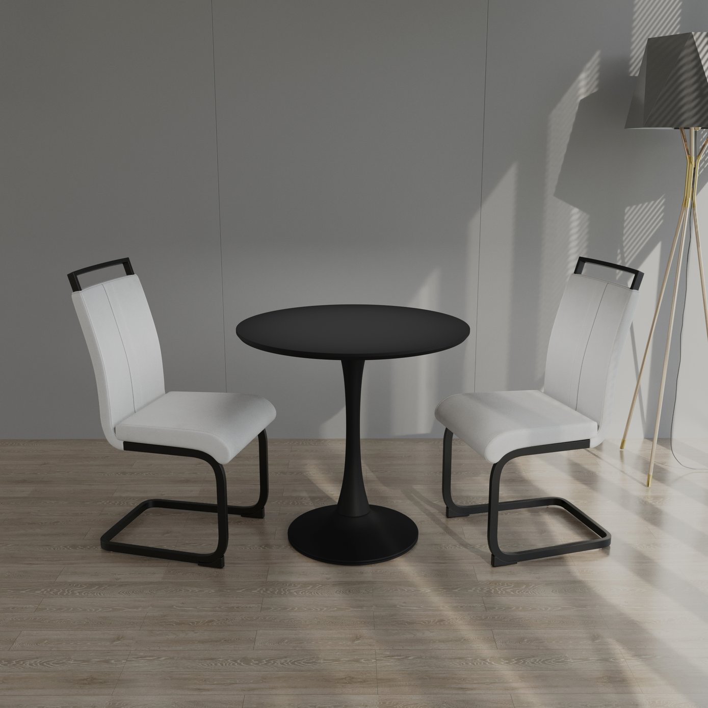 Enhance your compact dining area with this modern black tulip-style dining set designed for effortless style and everyday comfort. The set includes a 31.5" round MDF tabletop with a sturdy metal tulip base and two white PU-upholstered chairs with black metal legs — a perfect balance of contemporary design and practical durability for 2–4 people.