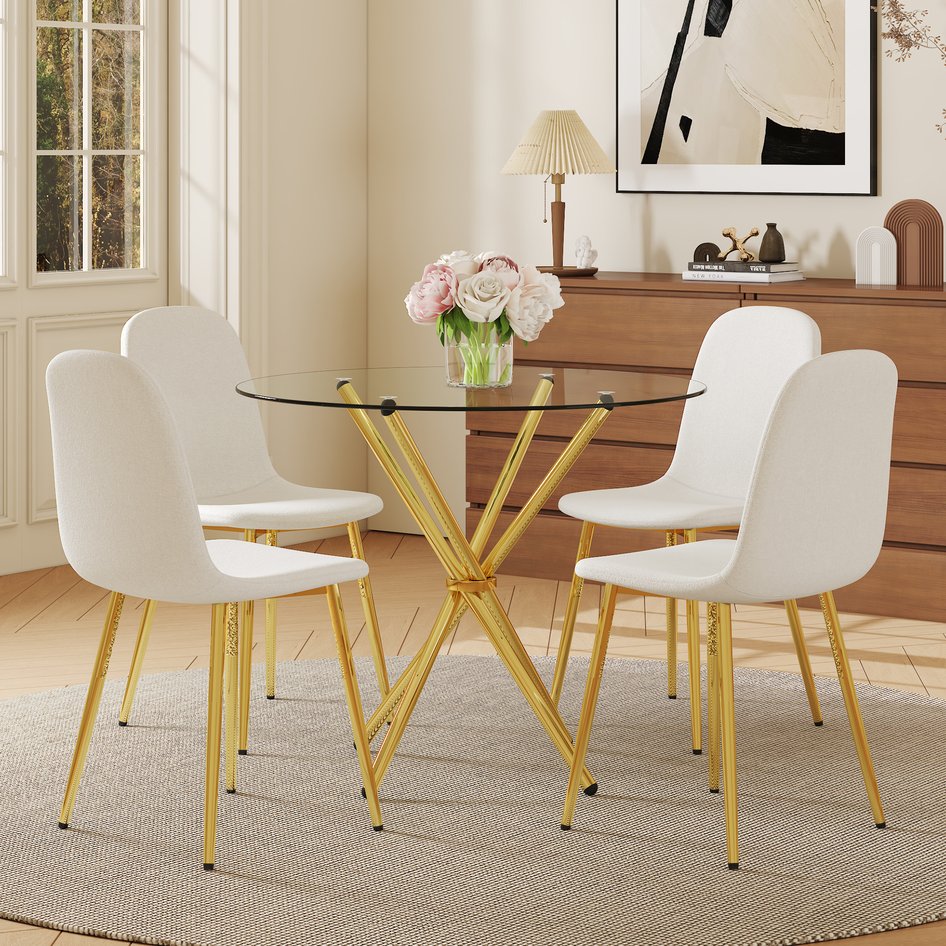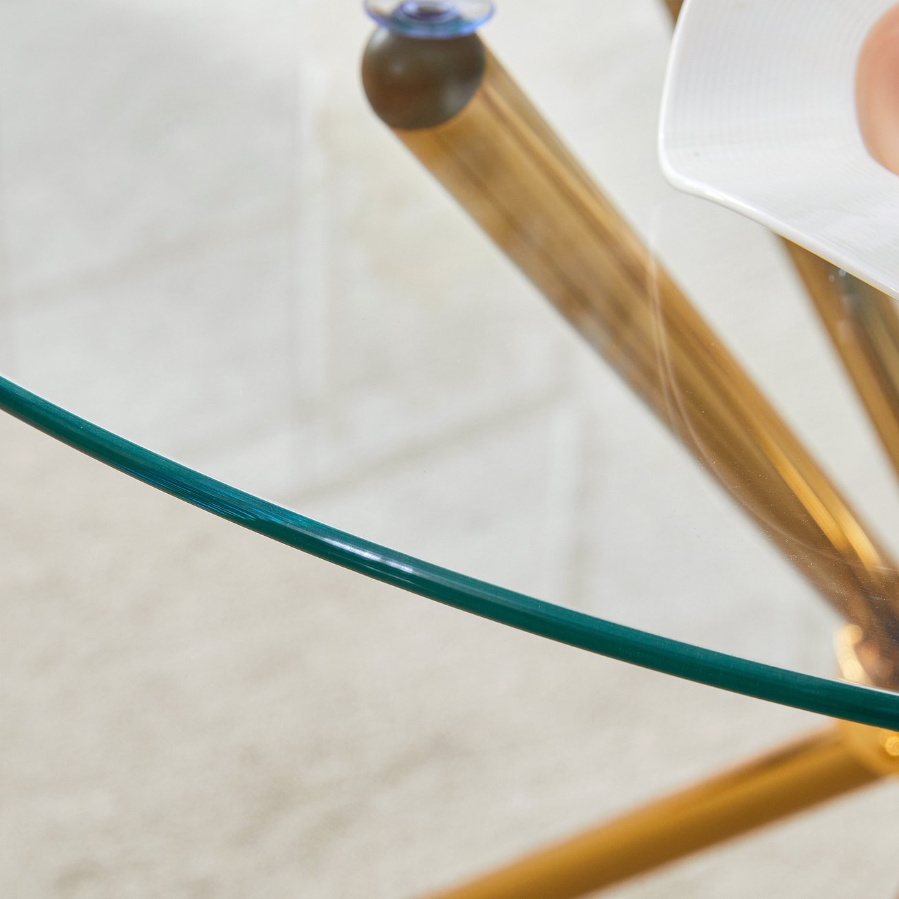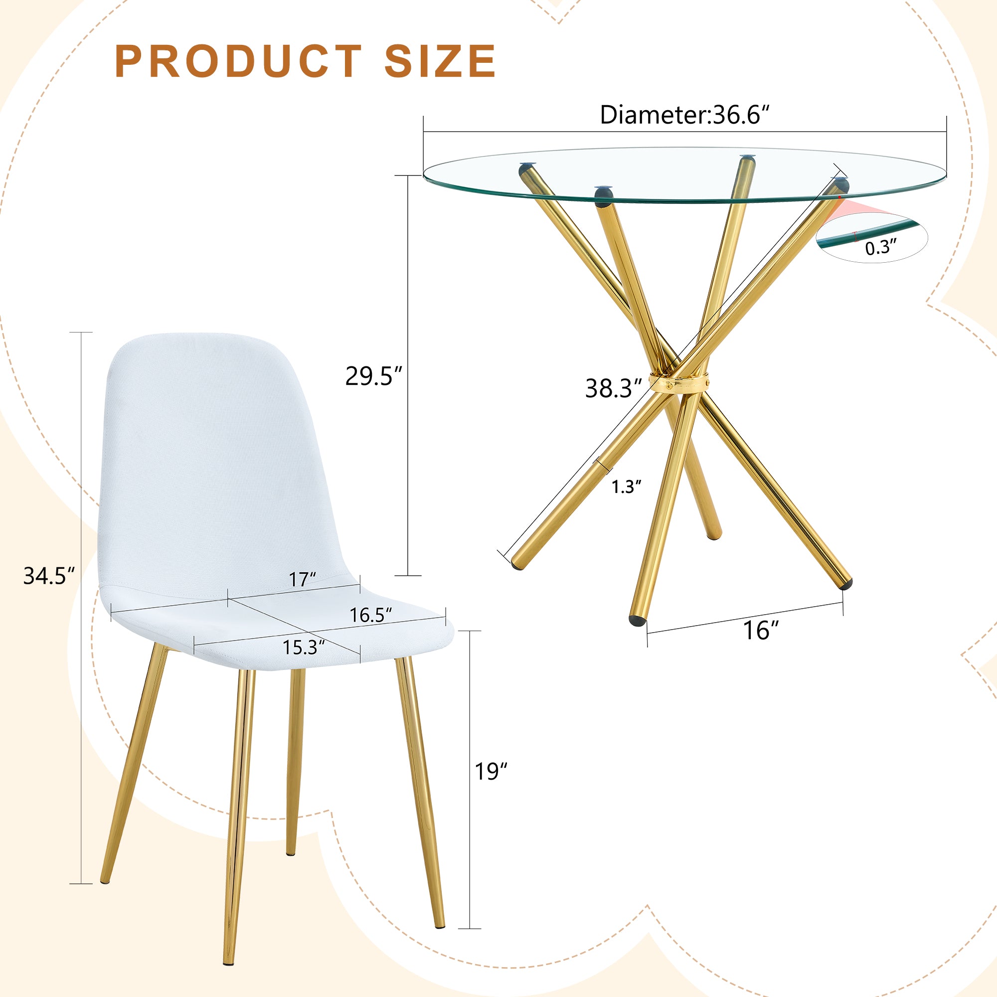 - Key materials: 36.6" round transparent tempered glass tabletop with finely polished edges; gold-finish metal legs; white linen-cotton upholstered chairs.