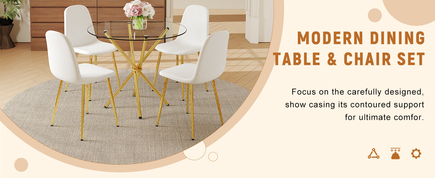 - Transparent glass table complements white-gold chairs, seamlessly blending into industrial, or minimalist interiors.Suitable for dining, coffee breaks, or home office work; smooth glass surface wipes clean effortlessly.