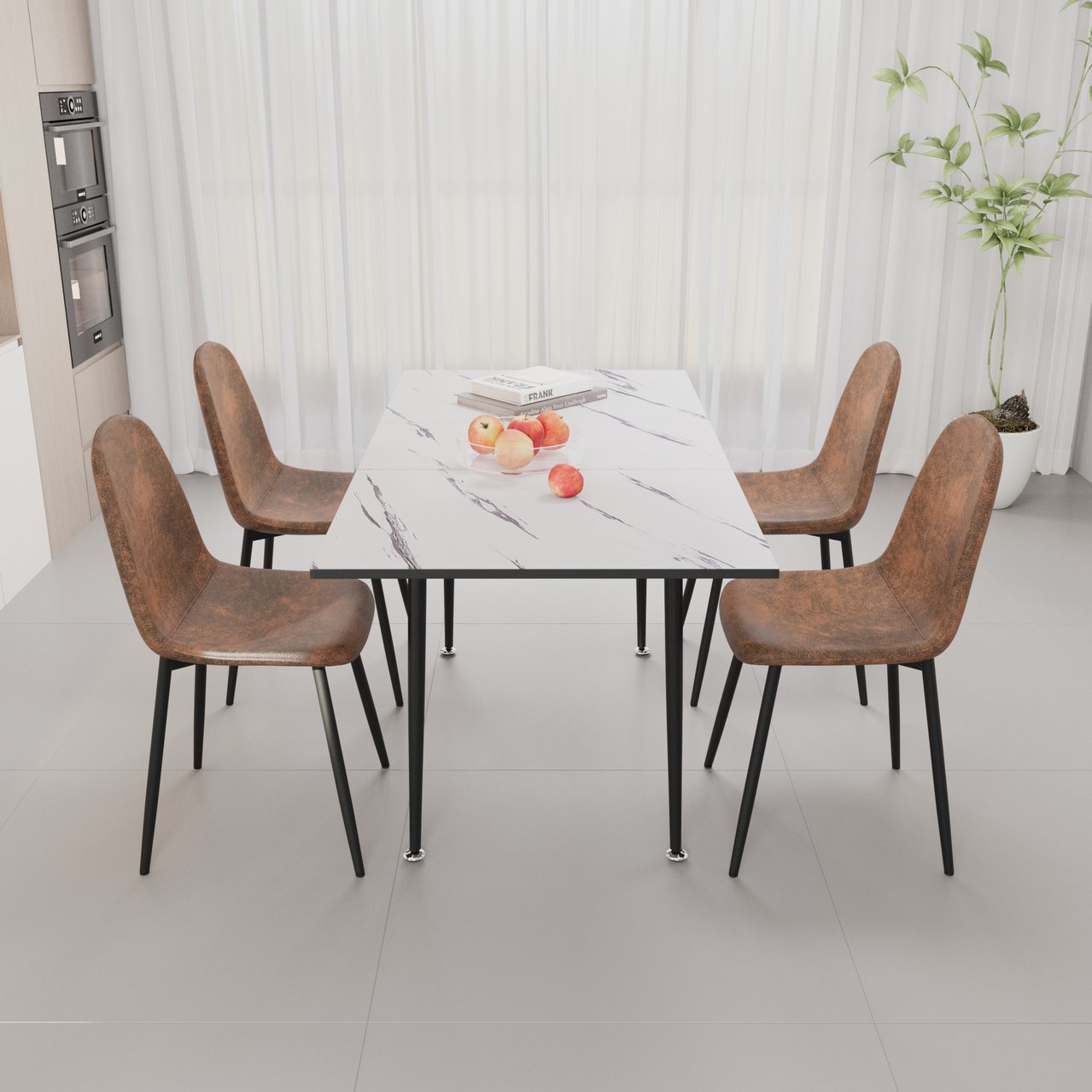 Give your dining area a sleek, space-saving upgrade with this modern extendable dining set. Combining a white MDF tabletop with a chic marble-effect finish, sturdy black metal base, and comfortable brown suede-like round chairs, this 4-piece set balances minimalist Italian-inspired style with practical features for everyday use — from quick cleanability to effortless extension that accommodates small families or guests.