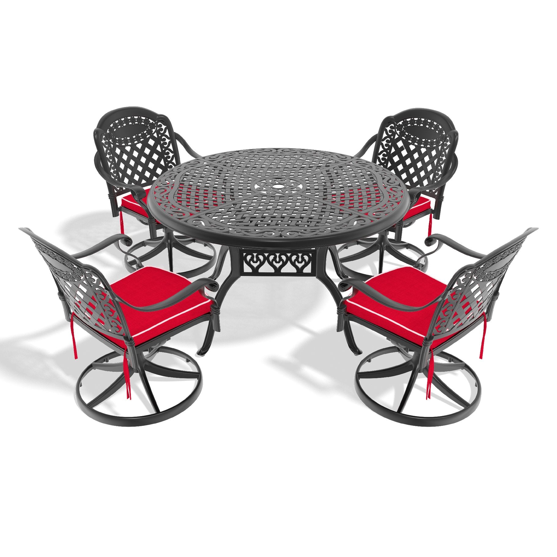 Enjoy outdoor dining with confidence and comfort — this 5-piece all-weather cast aluminum set pairs a spacious round table with four swivel chairs, offering durable construction and thoughtful details for everyday use or entertaining. Designed to resist the elements while providing smooth swivel action and supportive cushions, the set brings both function and style to patios, decks, and outdoor living spaces.