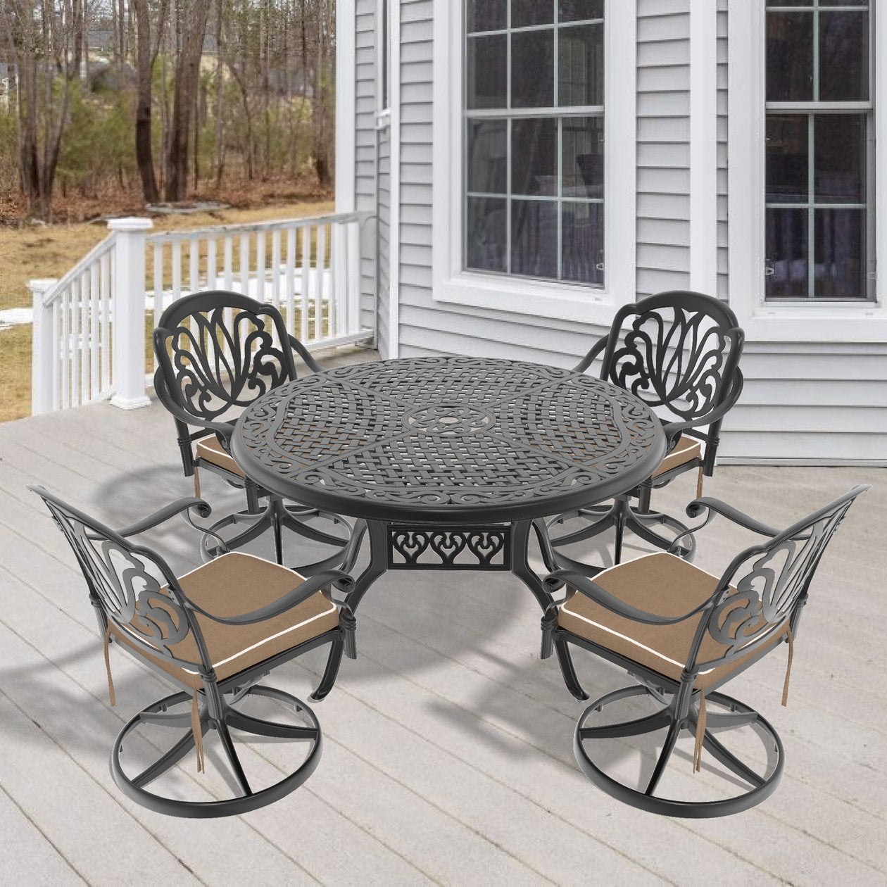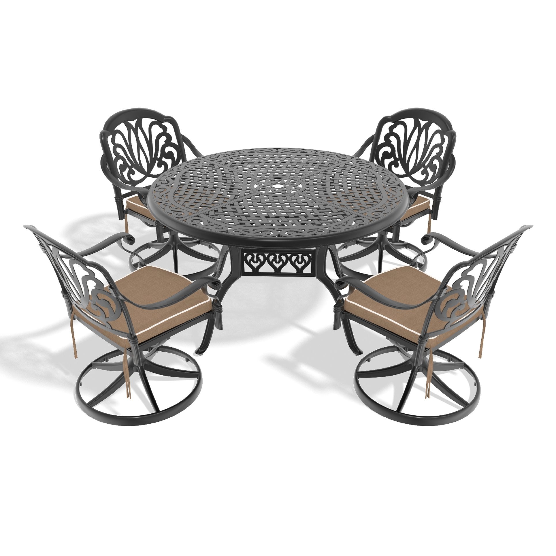 Enjoy relaxed outdoor dining with this durable 5-piece cast aluminum set designed for style, comfort, and all-weather performance. The set includes four swivel chairs with cushions and a 48.03" round table with umbrella hole—an ideal compact ensemble for patios, decks, or small outdoor spaces that balances sturdy construction with easy maintenance.