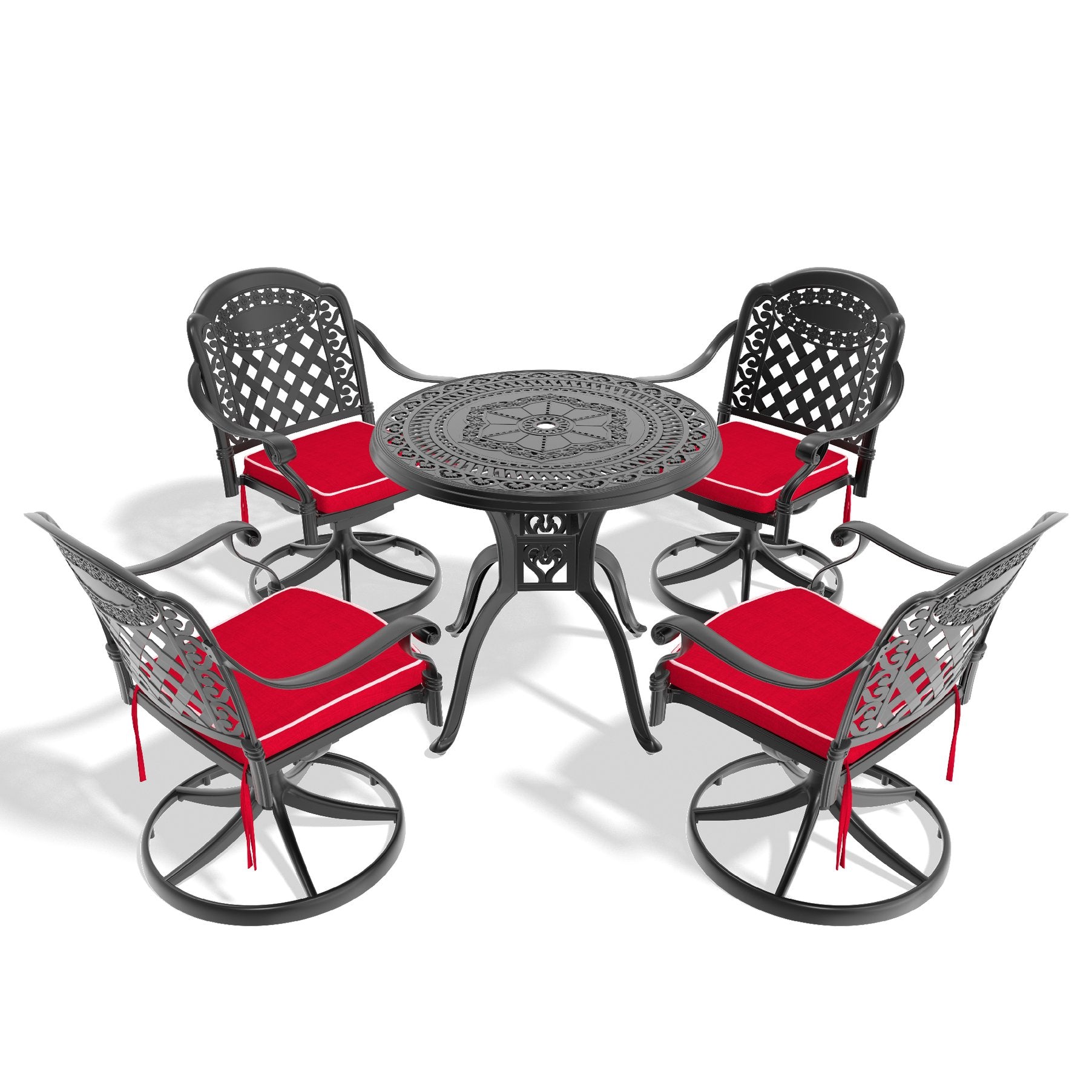 Enjoy relaxed outdoor dining with this durable 5-piece cast aluminum set designed for year-round use. The elegant black finish and swivel seating create a comfortable, casual atmosphere for patios, decks, or garden spaces, while weather-resistant materials and supportive cushions ensure lasting comfort and low maintenance.