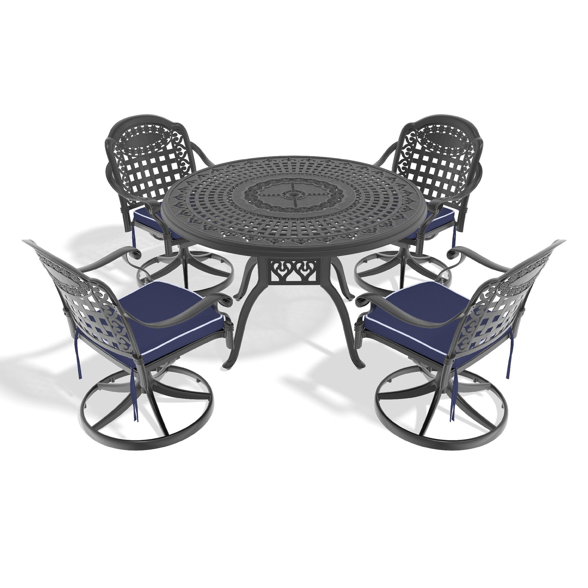 Elevate your outdoor dining experience with this durable, all-weather 5-piece dining set. Crafted from cast aluminum with a sleek black finish, the set includes four swivel chairs and a spacious round table designed for comfort, convenience, and lasting performance. Weather-resistant materials and plush cushions make this set ideal for patios, decks, and poolside gatherings, while thoughtful features like an umbrella-ready table and generous weight capacities ensure reliable everyday use.