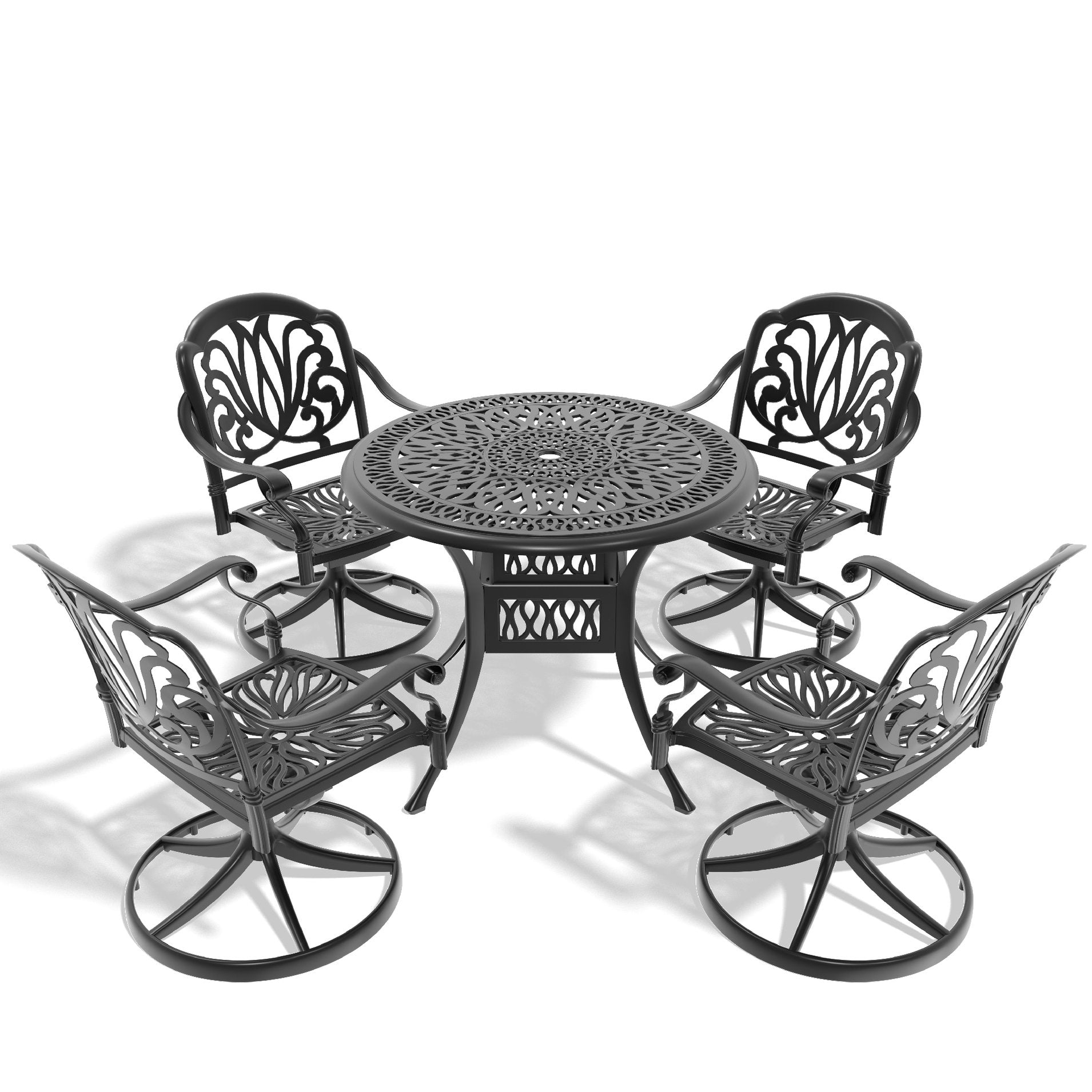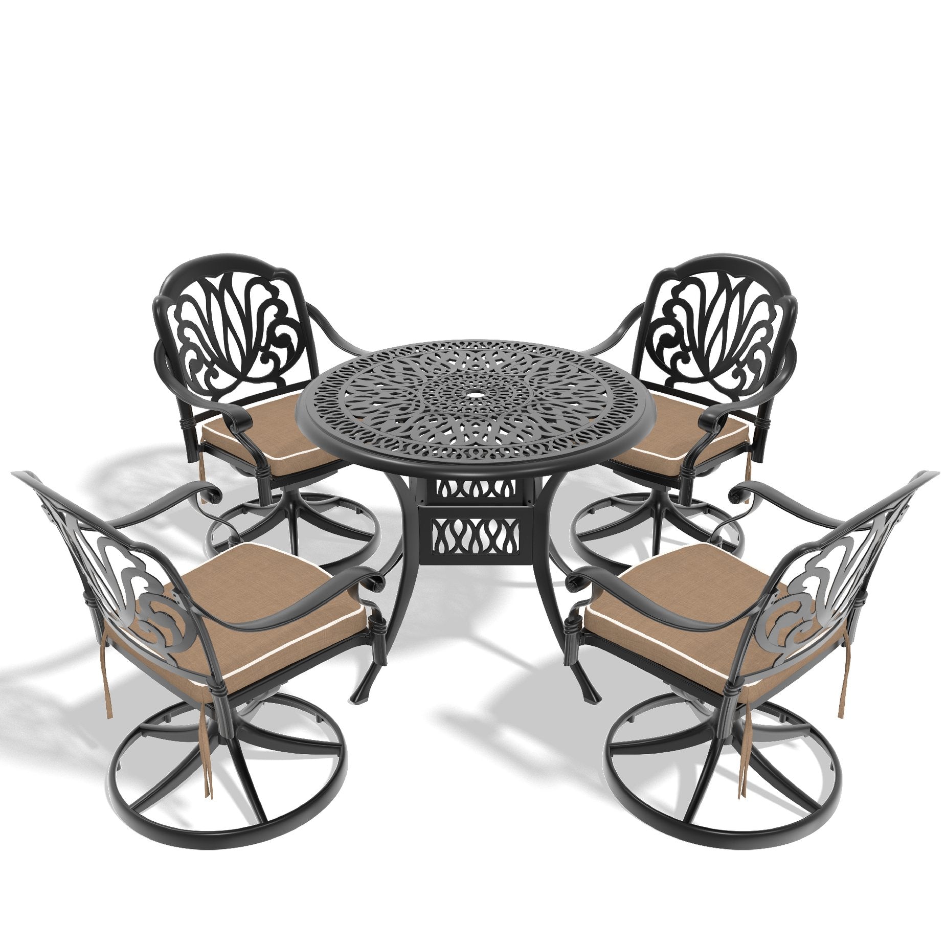 Enjoy outdoor meals and relaxed conversation with this durable 5-piece dining set designed for all-weather performance and everyday comfort. The cast aluminum frame and supportive swivel chairs combine low maintenance with upscale styling, while included cushions and a convenient umbrella-ready table make it ideal for patios, decks, or poolside dining.