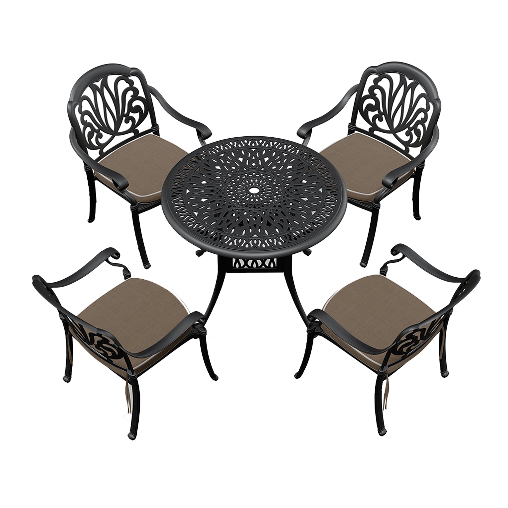 Upgrade your outdoor living space with this durable and stylish 5-piece cast aluminum patio set, complete with comfortable brown cushions. Crafted for longevity and easy maintenance, the set combines a round dining table with four stacking chairs to provide a compact, functional dining solution ideal for patios, decks, or small outdoor areas. The classic black frame and neutral cushions offer versatile appeal to match many décor styles.