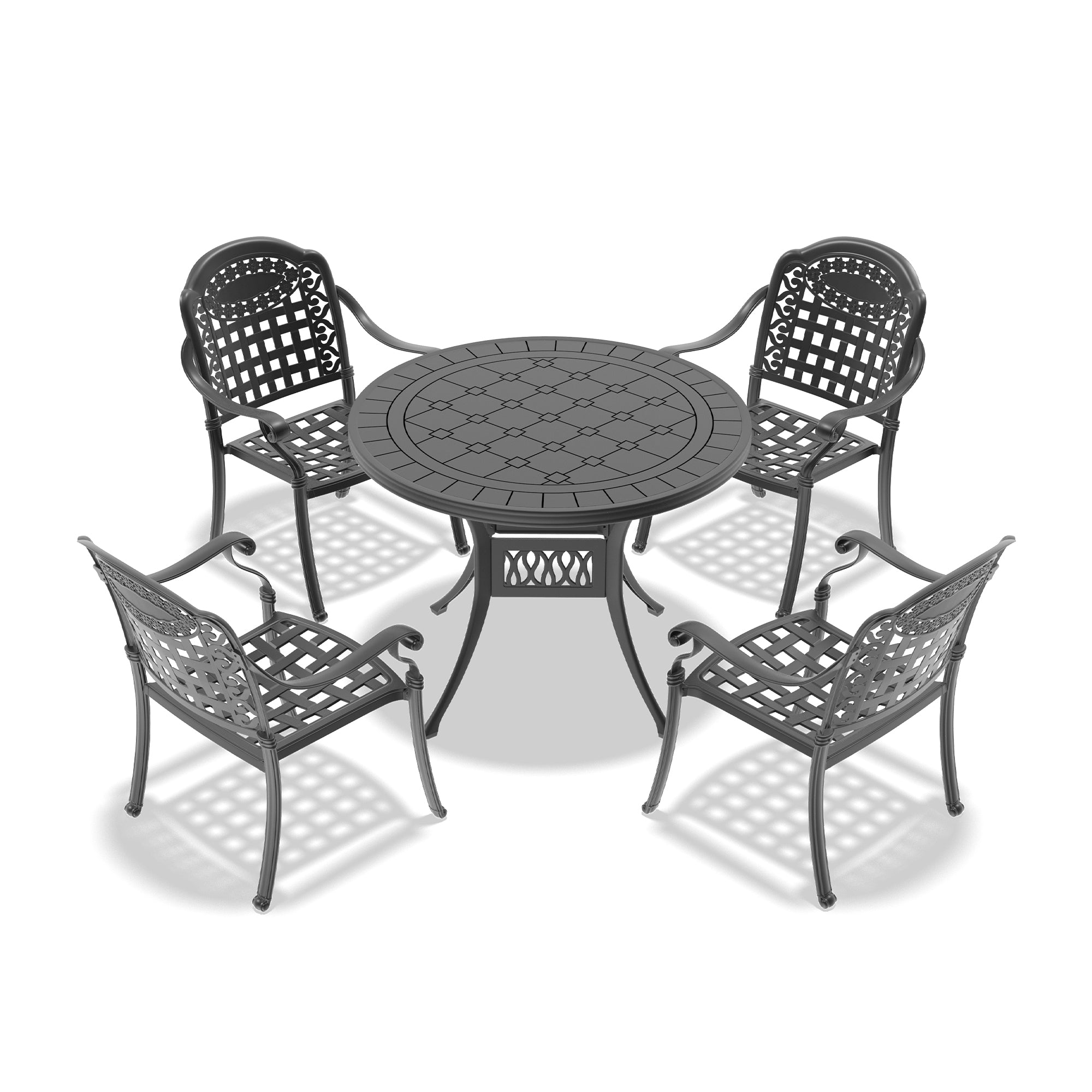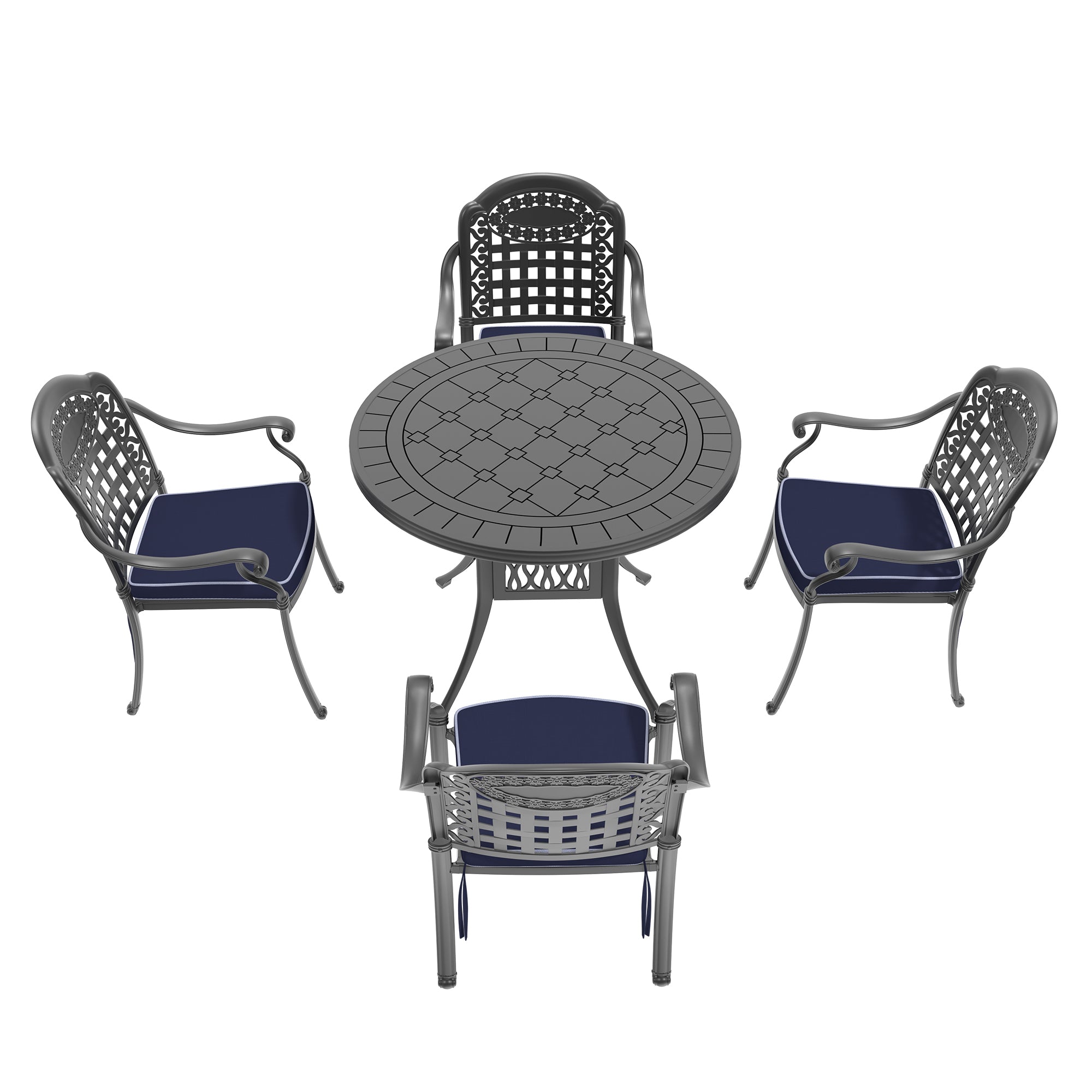 Upgrade your outdoor living space with this elegant 5-piece cast aluminum patio set, finished in classic black and paired with comfortable blue cushions. Designed for durability and year-round enjoyment, this set includes a round dining table and four stacking chairs that are lightweight to move yet sturdy enough to entertain. Perfect for small patios, balconies, or garden nooks, the set blends traditional styling with low-maintenance materials for long-lasting performance.