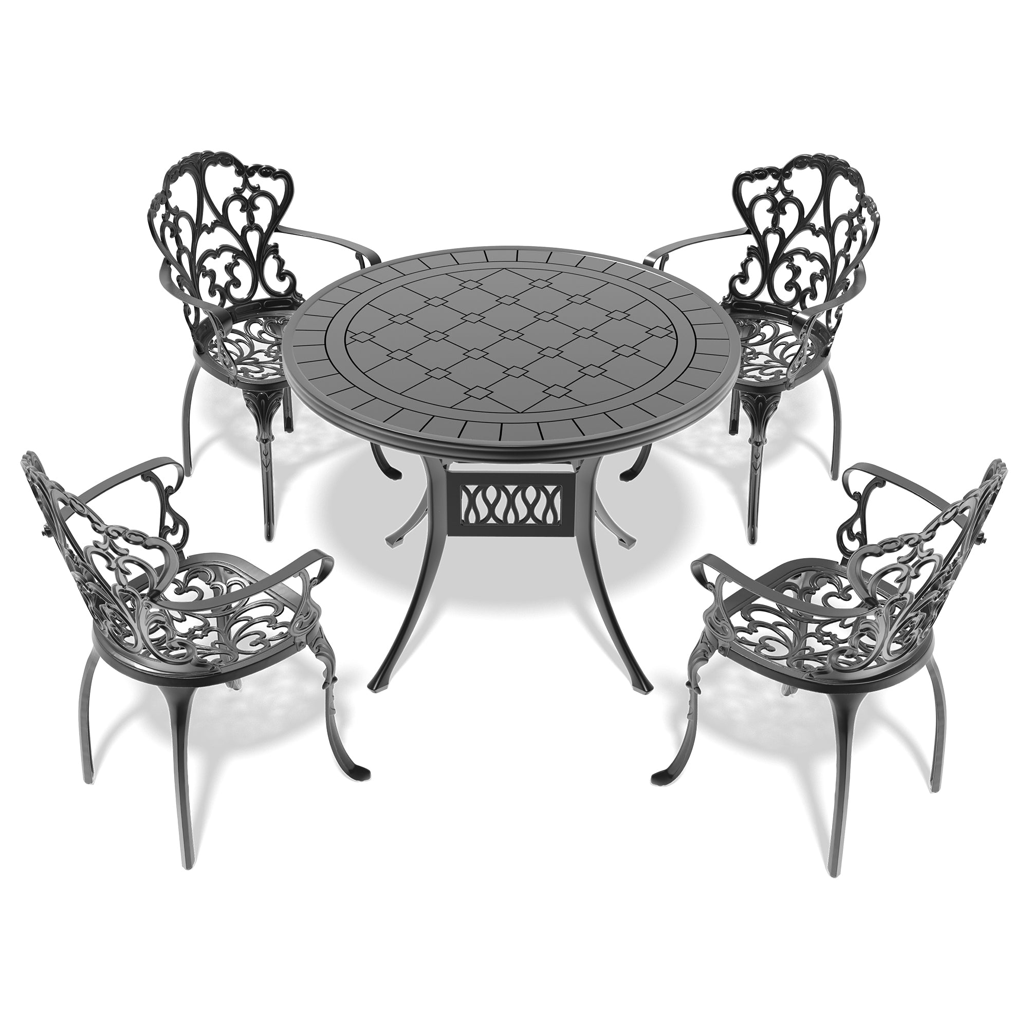 Refresh your outdoor space with this elegant 5-piece cast aluminum patio set, thoughtfully designed for comfort, durability, and easy maintenance. The set pairs a round dining table with four ergonomic chairs and plush off-white cushions, making it ideal for al fresco meals, morning coffee, or casual conversations on the patio, deck, or garden.