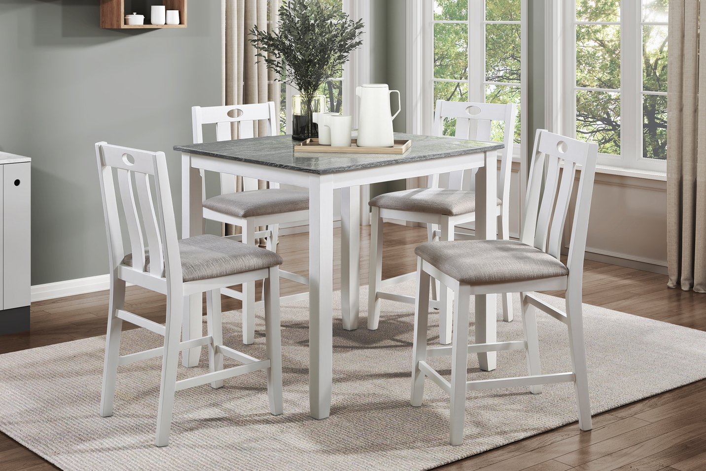 Bring casual charm and coastal-inspired contrast to your dining space with this 5-piece counter-height set. The Lowell Collection combines a bright white finish with weathered gray over oak veneer for a fresh, relaxed look that complements modern farmhouse and transitional interiors. This set includes a square counter-height table and four fabric-upholstered chairs — designed for comfort, durability, and easy everyday entertaining.
