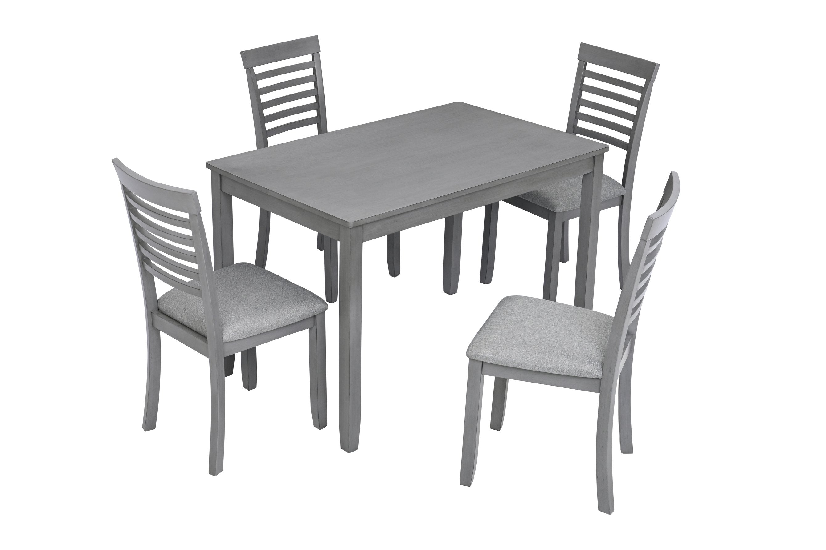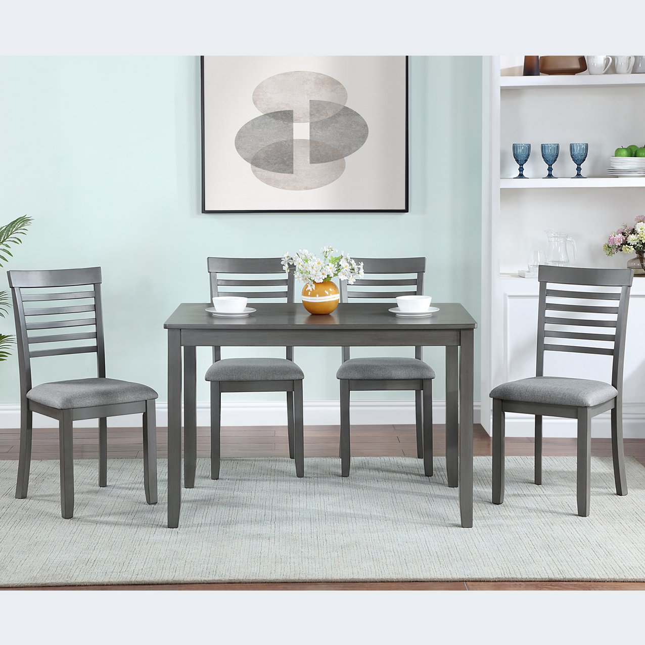 Bring modern simplicity and everyday comfort to your dining area with this 5-piece dining set. Clean lines, tapered legs, and textured gray upholstery create a contemporary look that fits small apartments or full dining rooms, while durable solid-wood construction and easy-care surfaces keep the set practical for daily use.