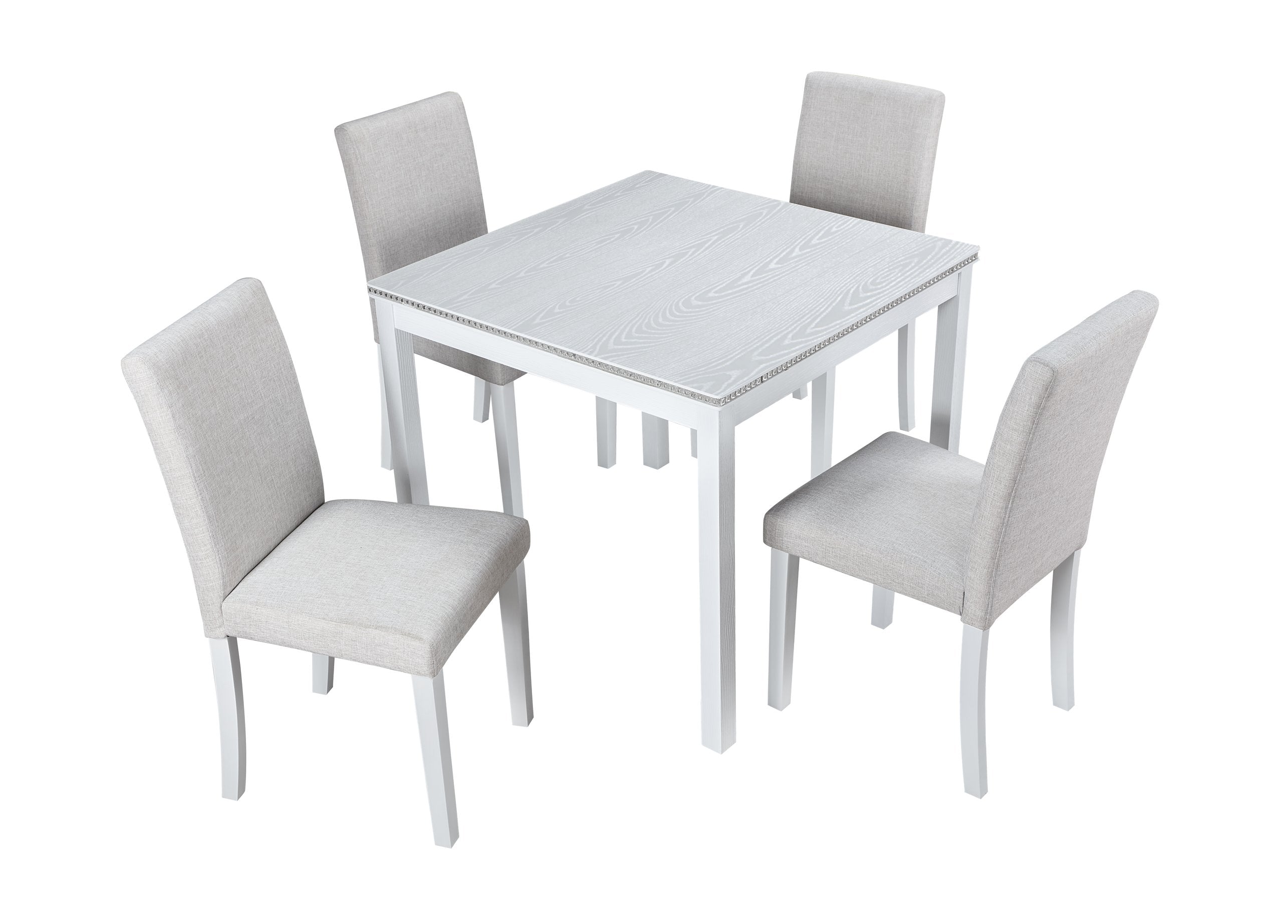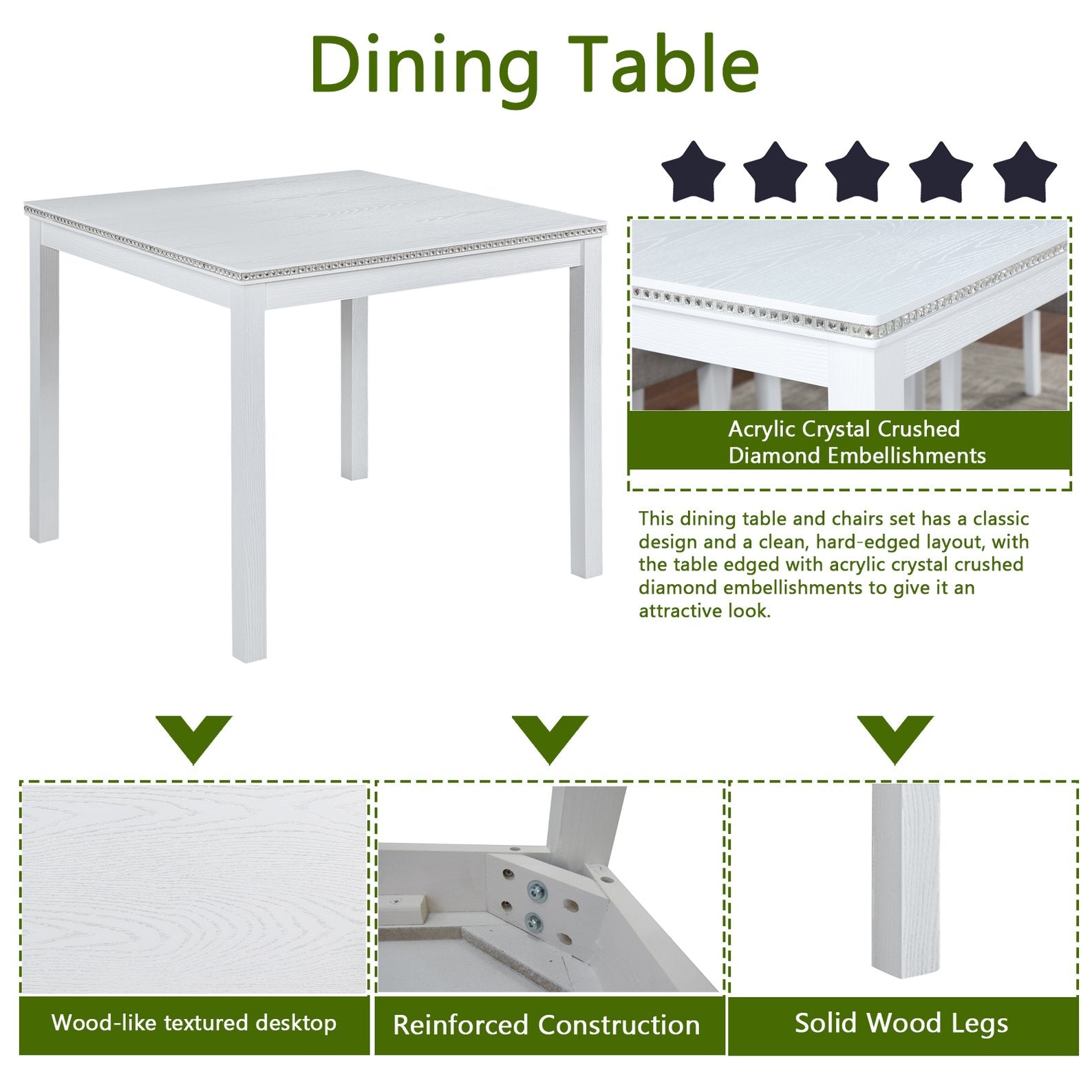 Refresh your dining space with this elegant 5-piece wooden dining set that combines modern details and practical comfort. The square table with a faux natural wood-grain MDF top and crystal-accented edges pairs perfectly with four ergonomically designed upholstered chairs—ideal for everyday meals or entertaining guests. Built from solid and engineered woods with durable finishes, this set offers stability, easy maintenance, and a refined look in white.