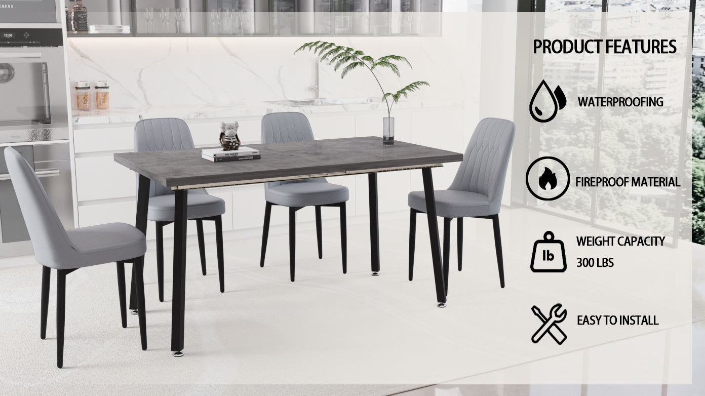 Bring versatile style and everyday comfort to your dining space with this expandable 5-piece set. The sleek grey MDF table features a smooth, easy-care surface and a clever extension mechanism that expands seating from intimate meals to gatherings for 4–6 people. Four thickly padded PU chairs with ergonomic back support and durable black metal legs provide luxurious comfort and a modern industrial look that suits kitchens, dining rooms, home offices, or reception areas.