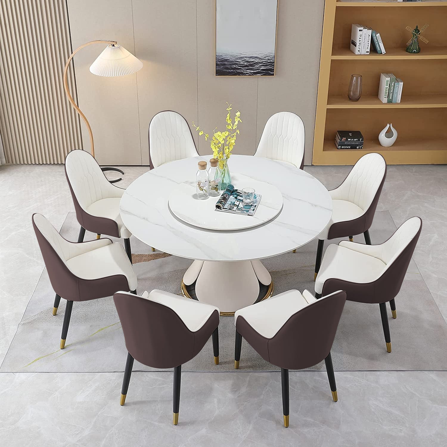 Elevate your dining space with this modern sintered stone dining set that blends refined materials and practical design. The four-leaf-clover shaped table top and contrasting pedestal base create a sculptural focal point, while the included turntable and eight chairs make the set ideal for family meals, entertaining, or upscale commercial use. Finished in Ancient White with a blue-jade marble appearance, the durable sintered stone surface and stainless steel accents deliver lasting beauty and easy maintenance.