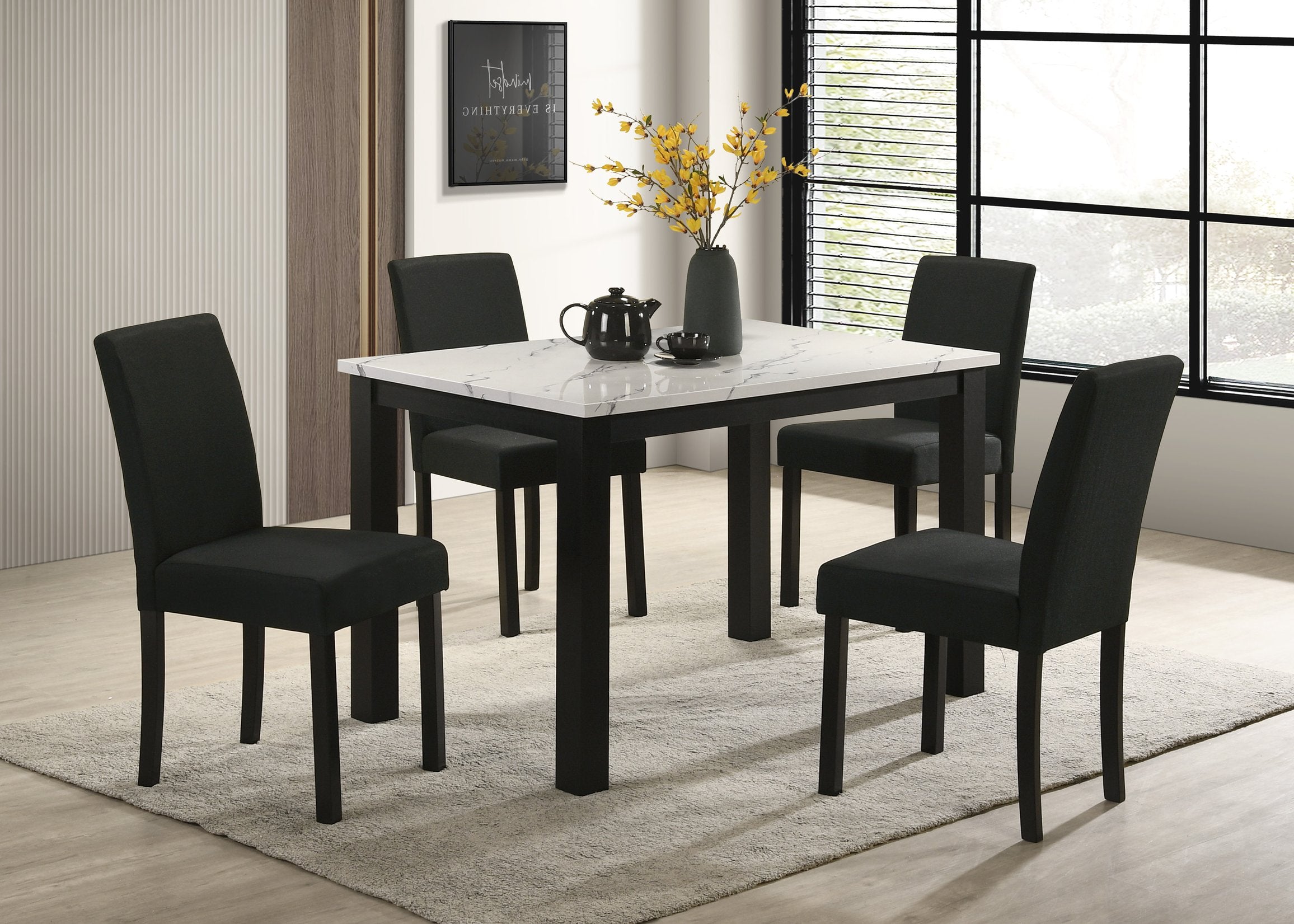 Elevate your dining space with this modern 5-piece set that blends contemporary design with everyday practicality. A faux-marble tabletop adds upscale visual appeal while the plush charcoal upholstered chairs and sleek black legs deliver comfort and refined contrast. Thoughtfully sized for compact dining areas, this set is ideal for breakfasts, intimate dinners, or small entertaining spaces.