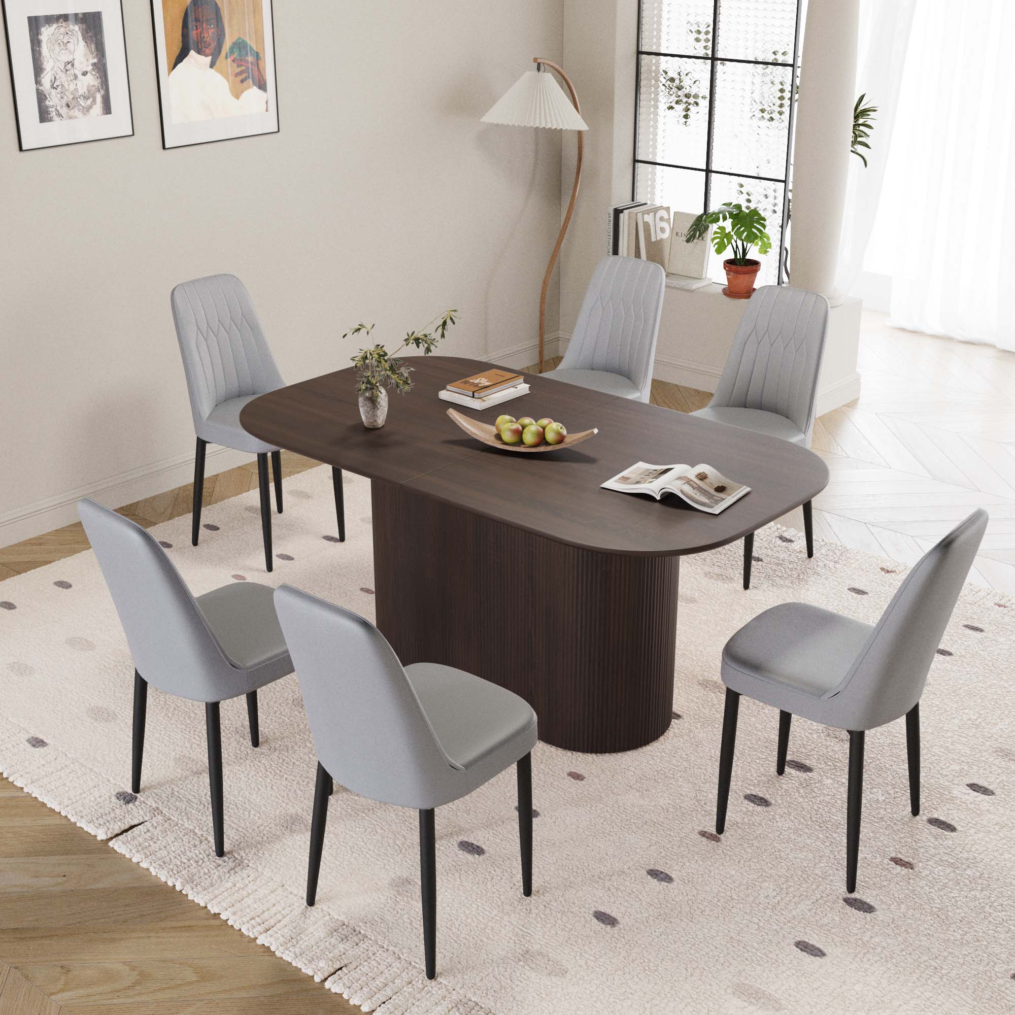 - 8.7 sets of tables and chairs: a table that can accommodate 4-8 guests for gatherings and 6 ergonomic artificial leather modern luxury style dining chairs, creating a fashionable focus for you in the dining area.