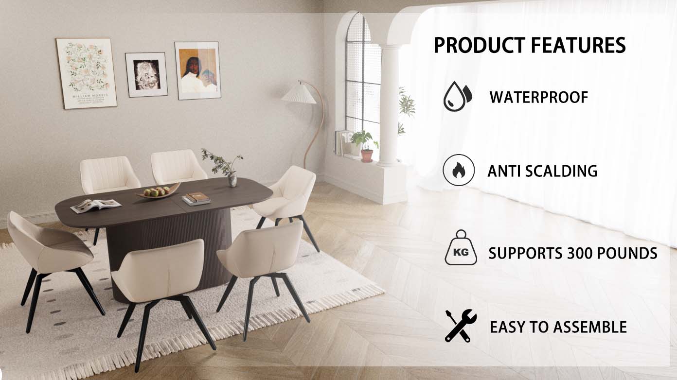 - 8.7 sets of tables and chairs: a table that can accommodate 4-8 guests for gatherings and 6 ergonomic artificial leather modern luxury style dining chairs, creating a fashionable focus for you in the dining area.