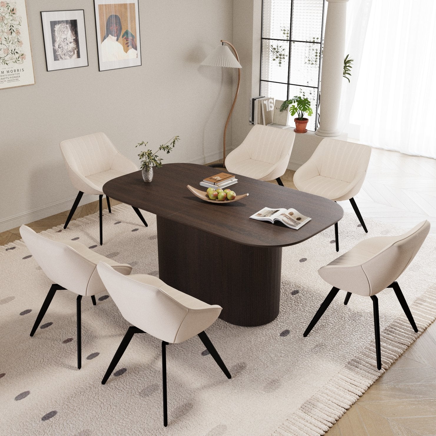 Upgrade your dining space with this stylish medieval-modern dining set—designed to combine form and function for everyday meals and special gatherings. The set pairs a warm brown MDF tabletop with six beige PU-upholstered chairs on black metal legs, delivering a refined, mid-century-inspired look that suits modern, transitional, and traditional interiors. Built for comfort and durability, the set is easy to assemble and maintain, making it a practical, eye-catching focal point for home and kitchen dining areas.