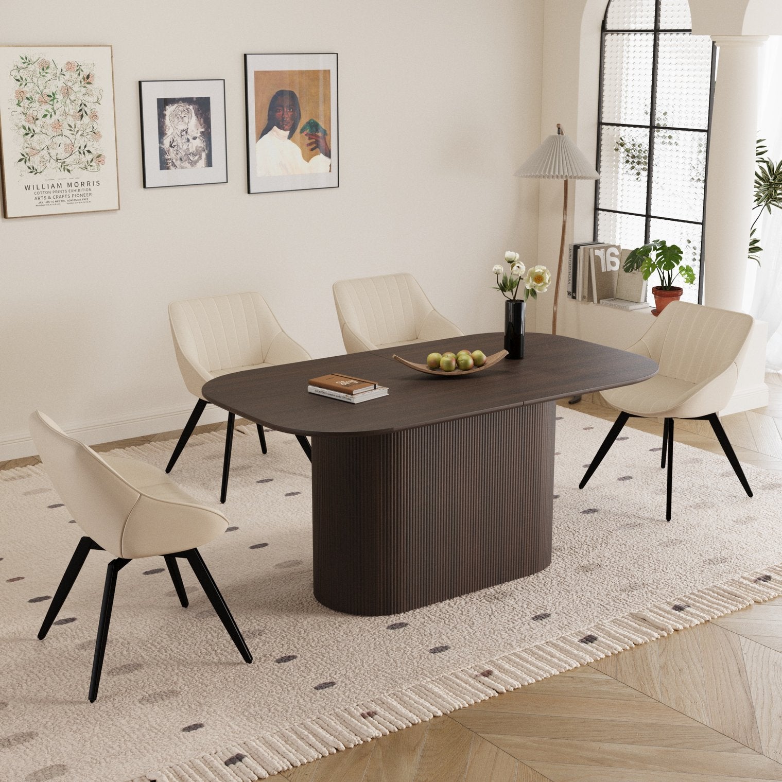 Elevate your dining space with this stylish 5-piece set that blends mid-century warmth and modern industrial flair. The 63" brown MDF tabletop and four beige PU-upholstered chairs create a cohesive, inviting look that’s both practical and elegant—ideal for family meals, entertaining, or everyday use. Durable finishes, comfortable high-density cushions, and sturdy black metal legs deliver long-lasting performance and easy maintenance.