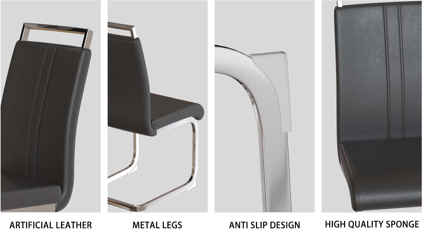 - Materials: MDF tabletop with stain-resistant finish; PU (artificial leather) upholstery on chairs; silver-plated metal C-shaped legs