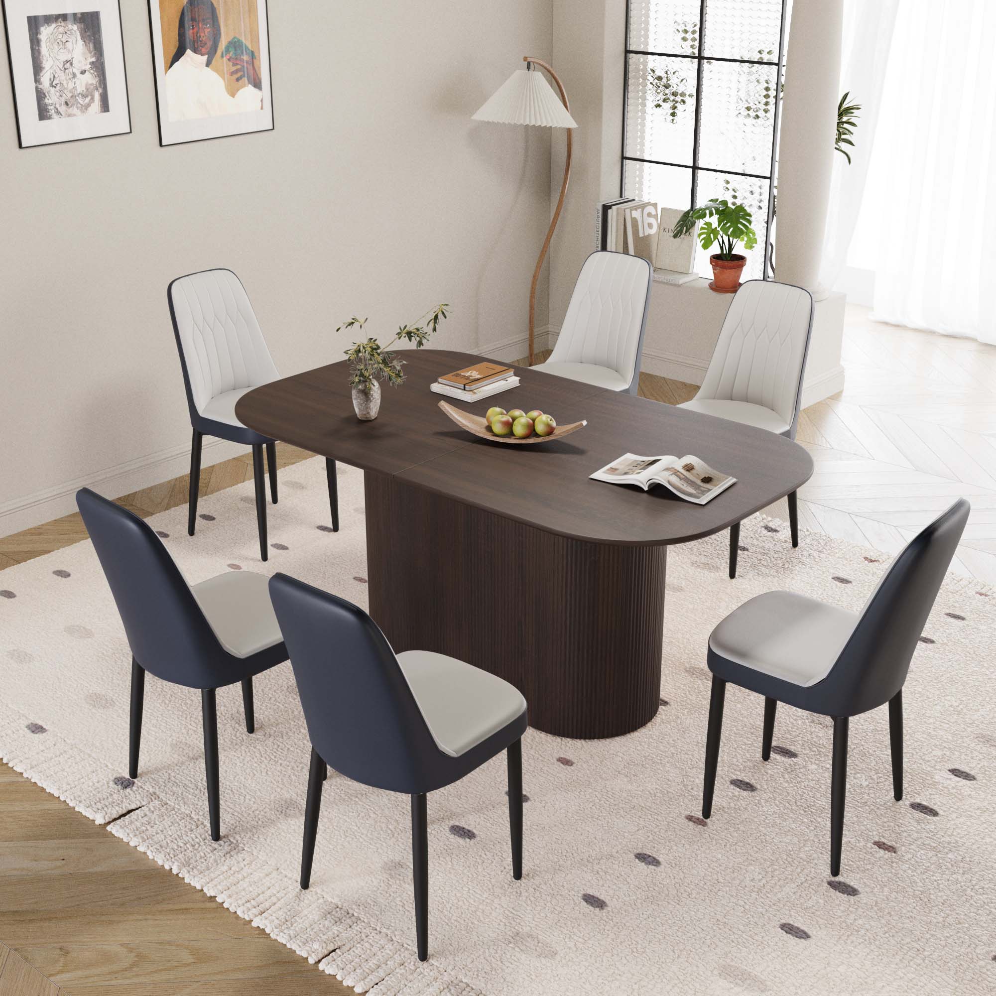 - 8.7 sets of tables and chairs: a table that can accommodate 4-8 guests for gatherings and 6 ergonomic artificial leather modern luxury style dining chairs, creating a fashionable focus for you in the dining area.
