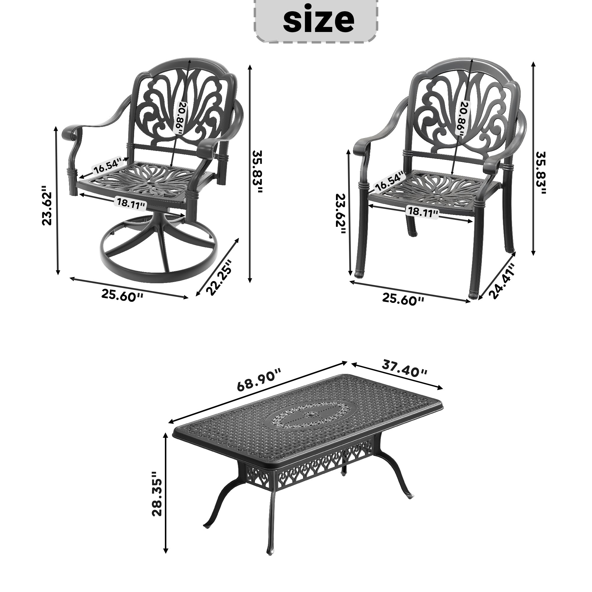 Enjoy outdoor dining and lounging with this durable 7-piece all-weather cast aluminum set designed for comfort, style, and low maintenance. Ideal for patios, decks, and poolside entertaining, the set pairs a spacious rectangular table and six cushioned chairs — including two 360° swivel seats — with a powder-coated black finish that resists rust and fading.