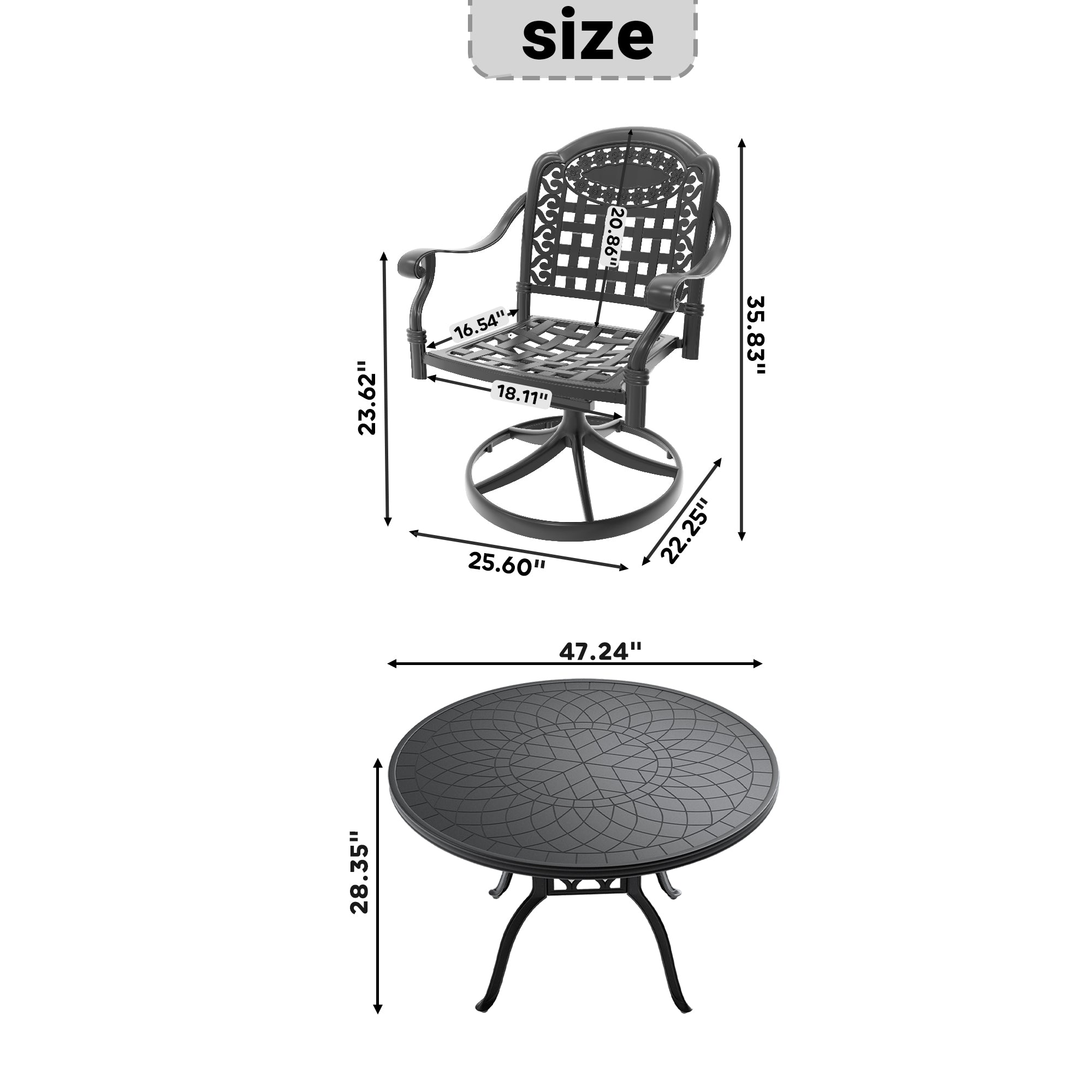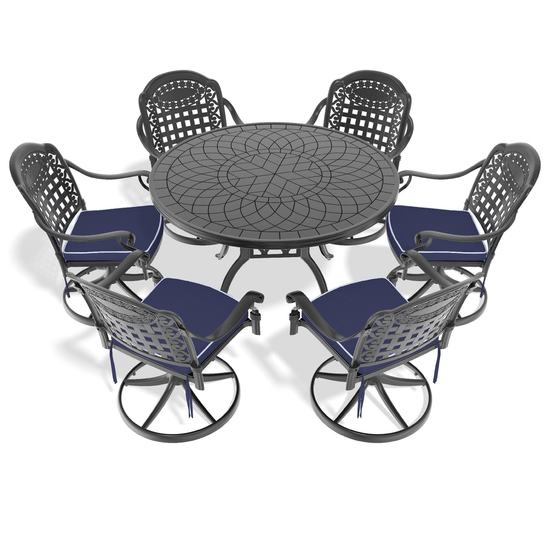 Enjoy outdoor dining in style with this durable 7-piece all-weather cast aluminum set, designed for comfort, stability, and low maintenance. The classic black finish and swivel chairs create a welcoming, versatile look for patios, decks, and garden spaces, while weather-resistant materials ensure season-long enjoyment. Cushions add comfort and are included for immediate use.