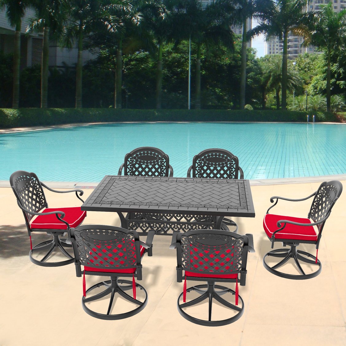 Upgrade your outdoor dining experience with this durable 7-piece all-weather cast aluminum set, designed for comfort, style, and low maintenance. The set includes a rectangular dining table and six swivel chairs with cushions, all finished in a sleek black frame that resists rust and retains its look season after season. Ideal for patios, decks, or garden entertaining, this collection combines sturdy construction with practical features to accommodate family meals and social gatherings.