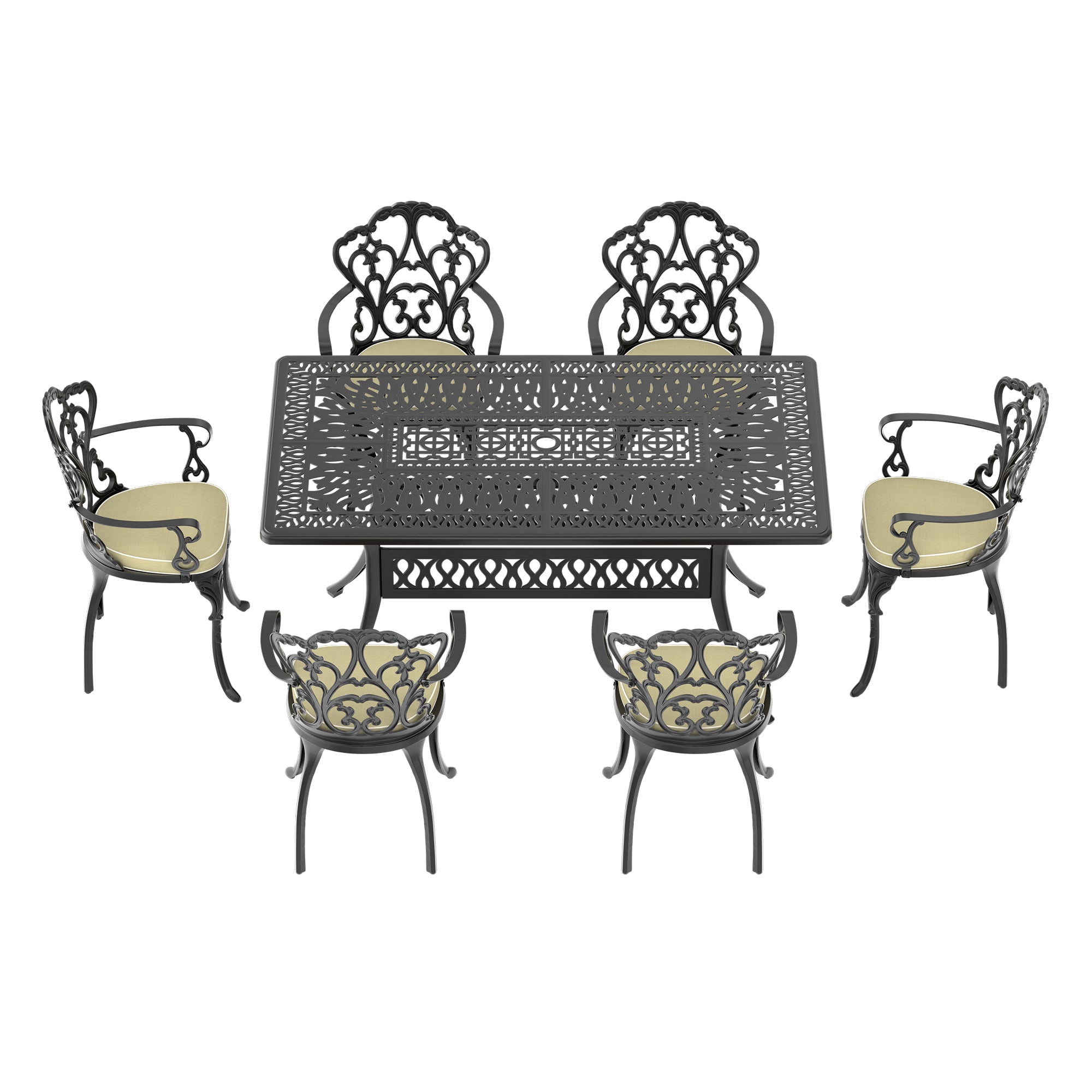 Bring outdoor dining and relaxed conversation to your patio with this durable 7-piece cast aluminum set, thoughtfully designed for comfort, style, and easy maintenance. The set includes a spacious rectangular table and six ergonomic chairs with off-white cushions that balance classic looks with modern performance—ideal for family meals, entertaining friends, or lounging outdoors season after season.
