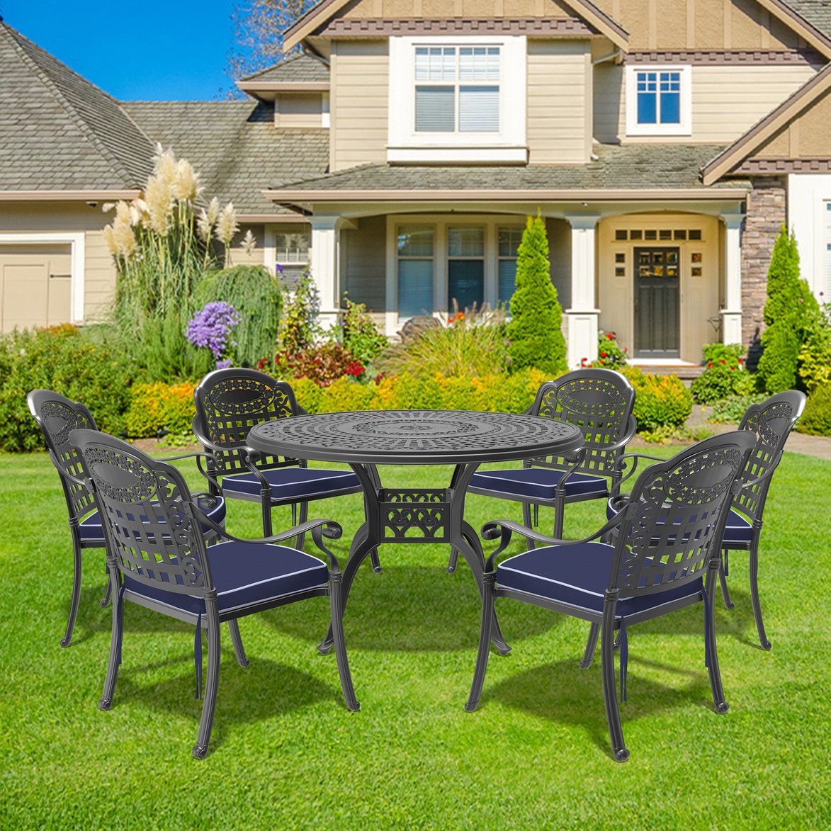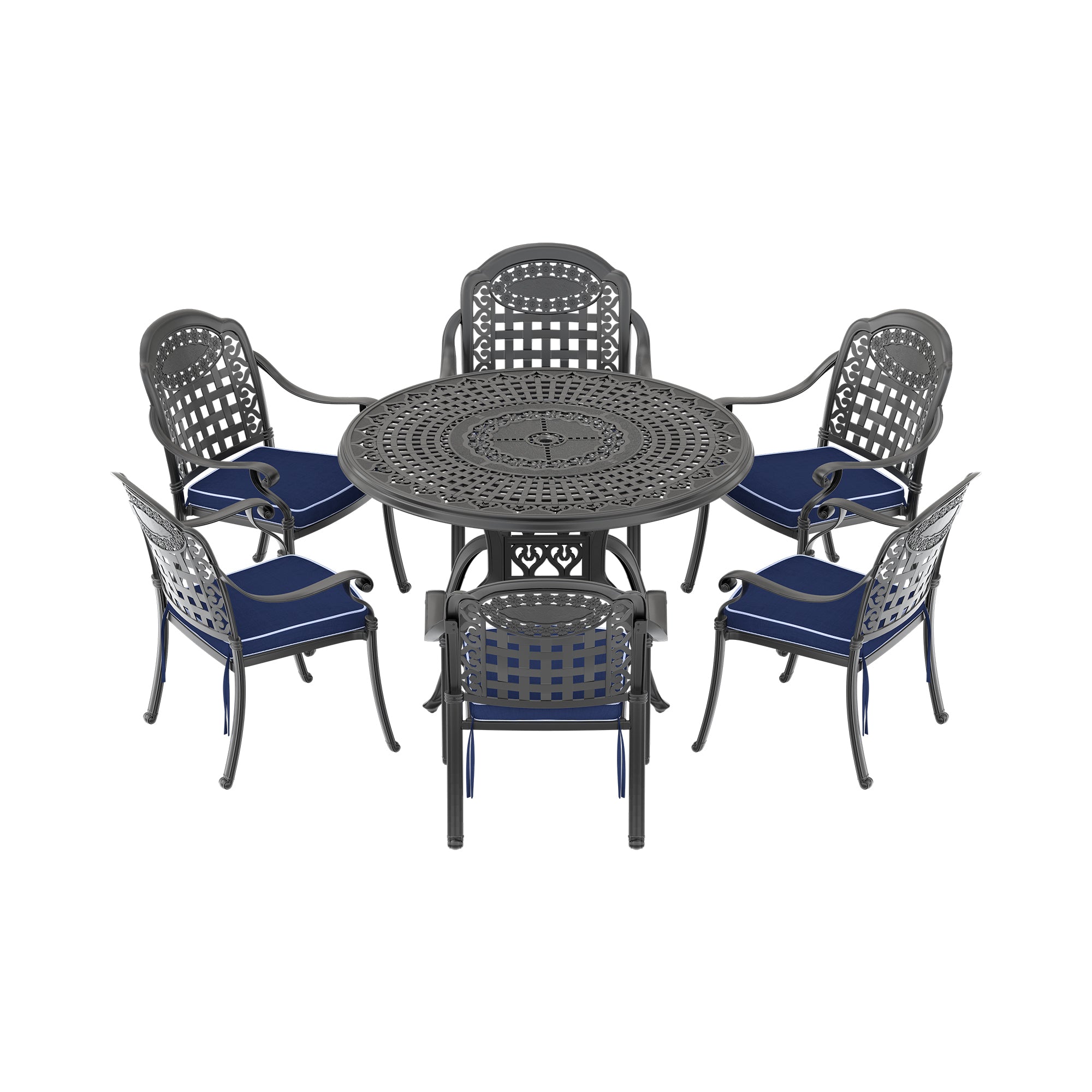 Enjoy relaxed outdoor dining with this durable 7-piece cast aluminum patio set, styled in a classic black finish with vibrant blue cushions. Designed for comfortable seating and easy maintenance, the set includes a round dining table and six stacking chairs—each cushion adds color and plush support while the umbrella-ready table top lets you create shaded comfort for sunny afternoons.