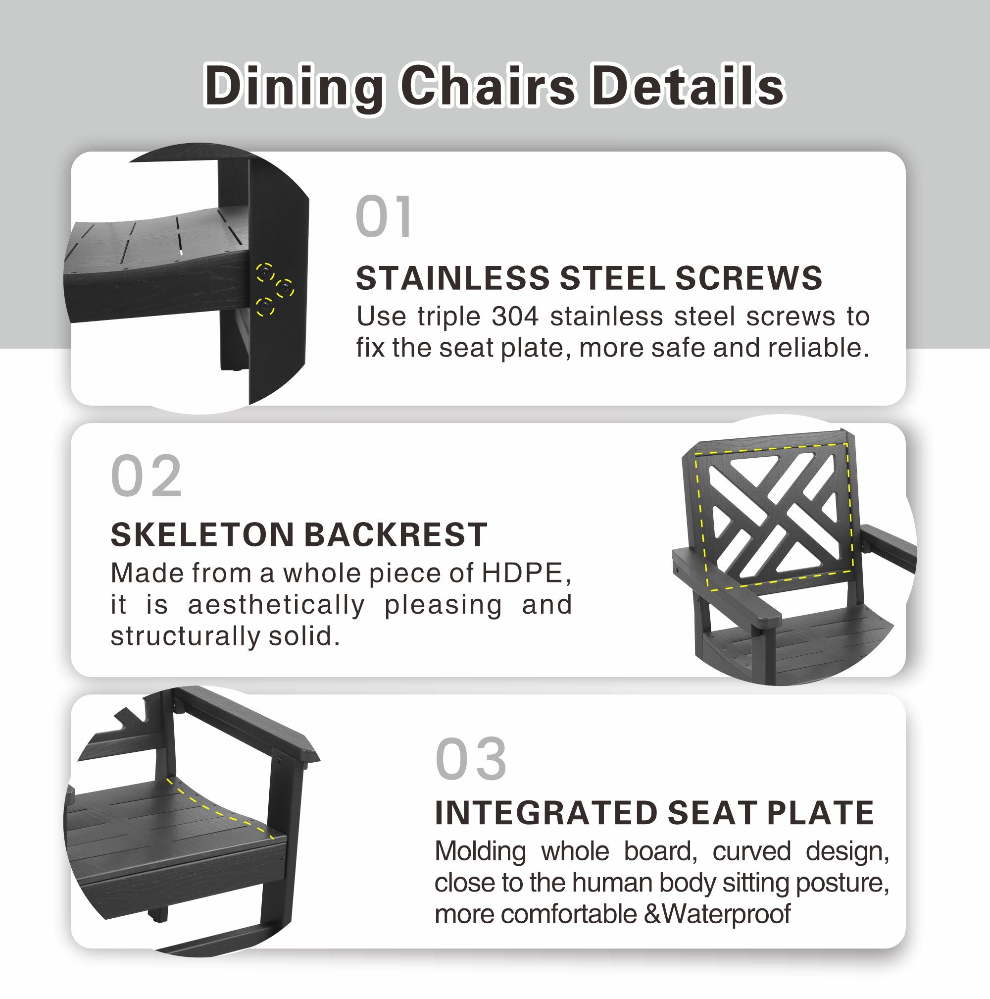 - All-Weather Durability: HDPE's inherent strength and weather-resistant properties make this 7-piece outdoor dining set impervious to the elements. From scorching sun to pouring rain, your garden, backyard, lawn, or poolside will remain elegantly furnished.