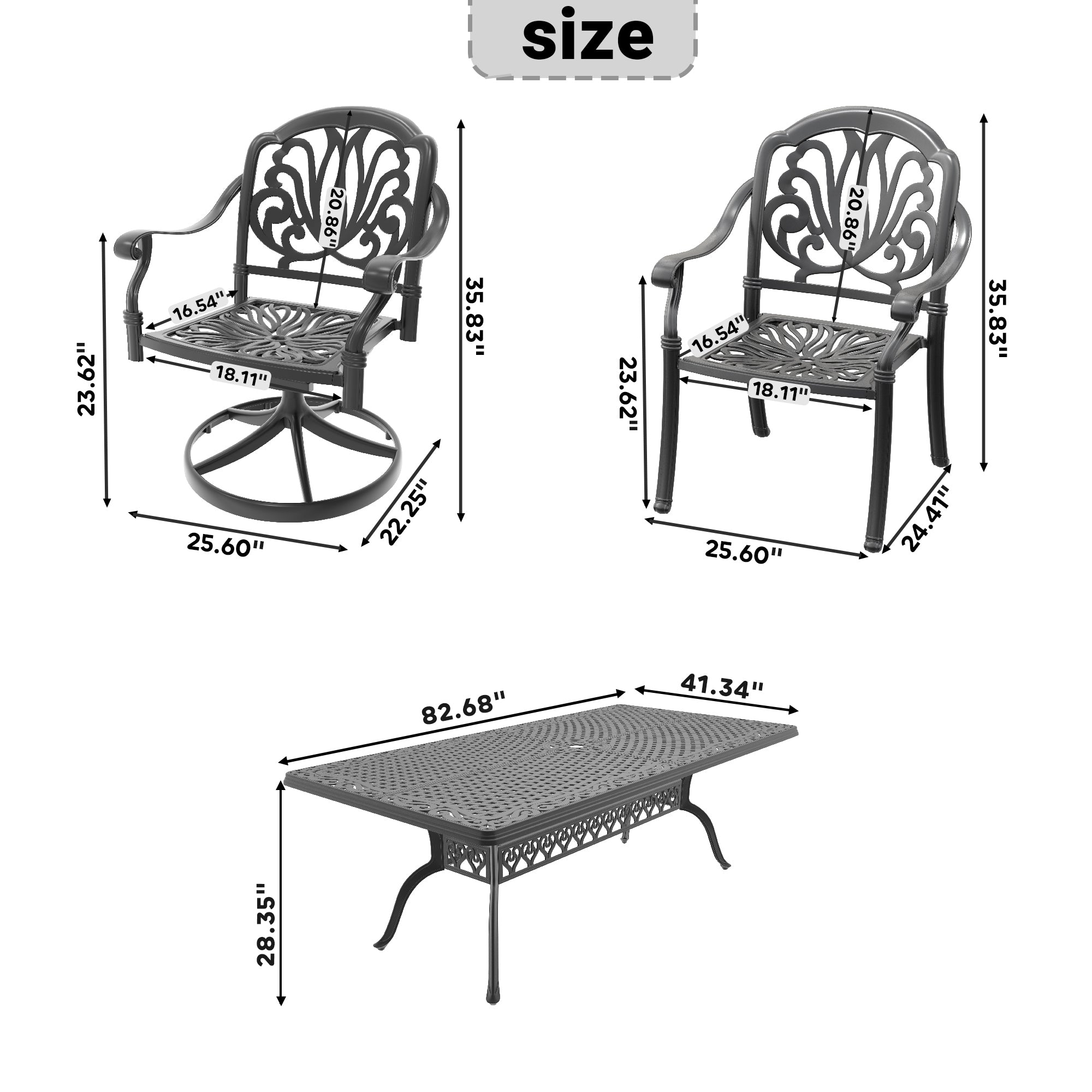 Brighten your outdoor dining experience with this durable 9-piece all-weather cast aluminum set, designed for comfort, style, and low maintenance. The set includes a roomy rectangular table, two swivel chairs, and six matching dining chairs — all crafted with a sturdy black aluminum frame and plush, weather-resistant cushions to accommodate family meals or entertaining guests with confidence.